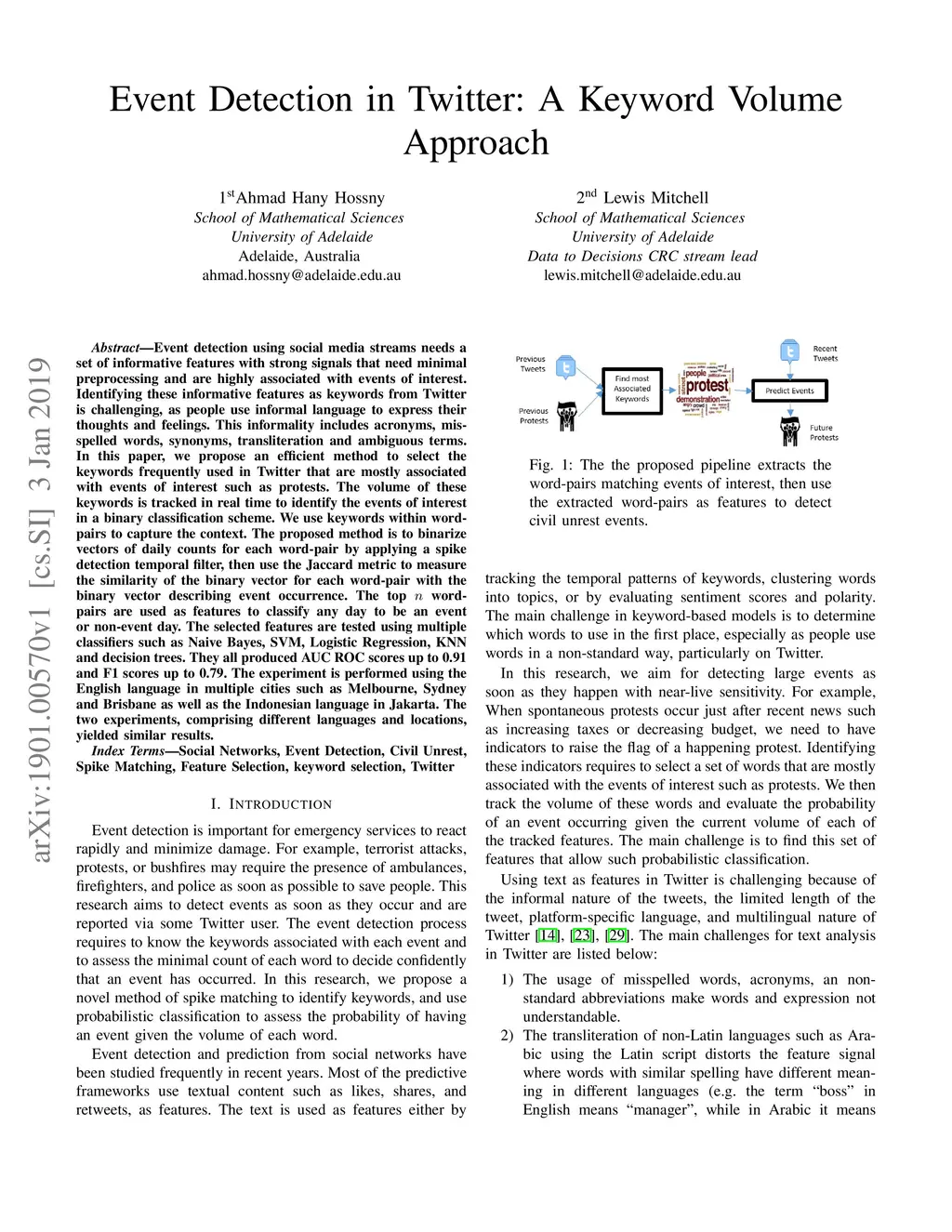 Event detection using social media streams needs a set of informative features with strong signals that need minimal preprocessing and are highly associated with events of interest. Identifying these informative features as keywords from Twitter is challenging, as people use informal language to express their thoughts and feelings. This informality includes acronyms, misspelled words, synonyms, transliteration and ambiguous terms. In this paper, we propose an efficient method to select the keywords frequently used in Twitter that are mostly associated with events of interest such as protests. The volume of these keywords is tracked in real time to identify the events of interest in a binary classification scheme. We use keywords within word-pairs to capture the context. The proposed method is to binarize vectors of daily counts for each word-pair by applying a spike detection temporal filter, then use the Jaccard metric to measure the similarity of the binary vector for each word-pair with the binary vector describing event occurrence. The top n word-pairs are used as features to classify any day to be an event or non-event day. The selected features are tested using multiple classifiers such as Naive Bayes, SVM, Logistic Regression, KNN and decision trees. They all produced AUC ROC scores up to 0.91 and F1 scores up to 0.79. The experiment is performed using the English language in multiple cities such as Melbourne, Sydney and Brisbane as well as the Indonesian language in Jakarta. The two experiments, comprising different languages and locations, yielded similar results.