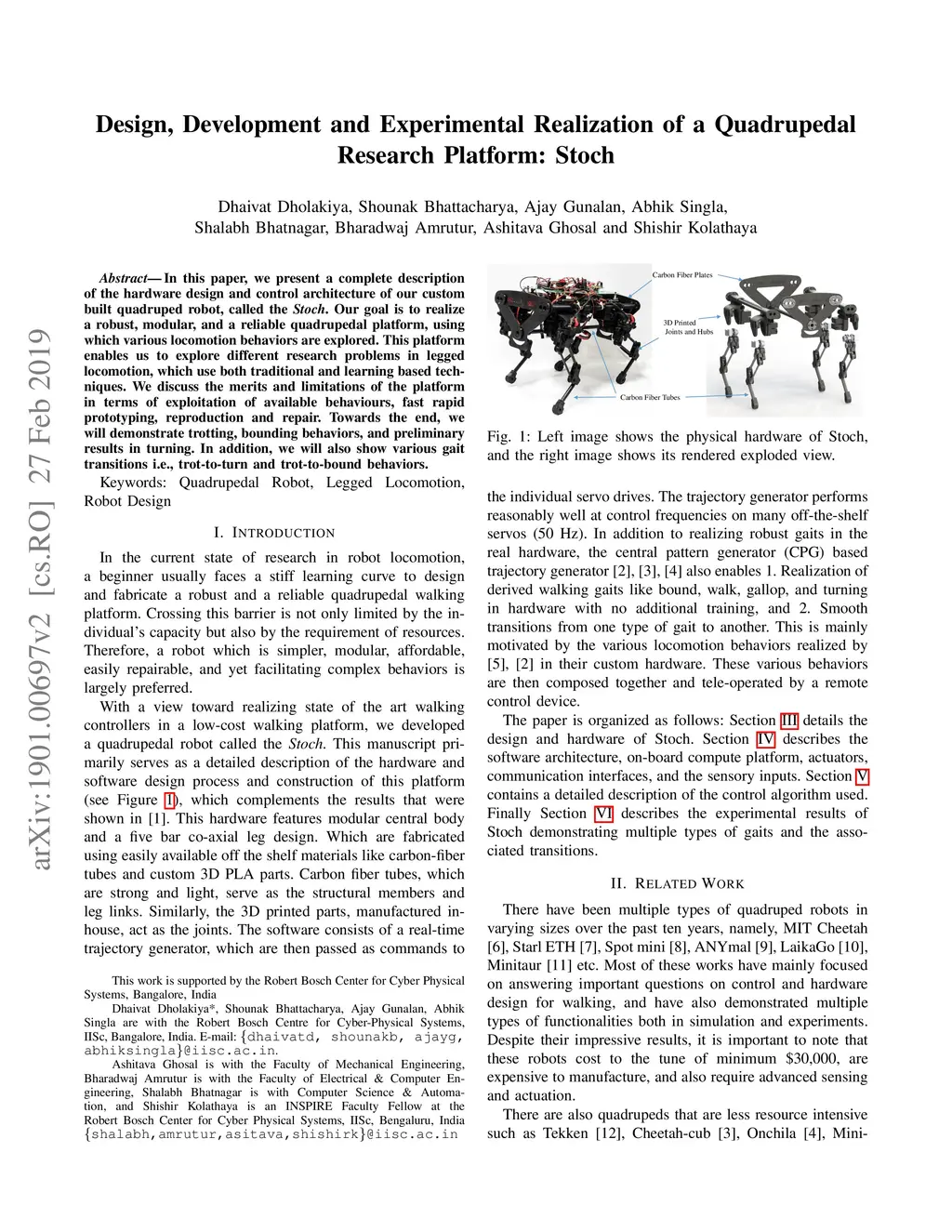 In this paper, we present a complete description of the hardware design and control architecture of our custom built quadruped robot, called the `Stoch'. Our goal is to realize a robust, modular, and a reliable quadrupedal platform, using which various locomotion behaviors are explored. This platform enables us to explore different research problems in legged locomotion, which use both traditional and learning based techniques. We discuss the merits and limitations of the platform in terms of exploitation of available behaviours, fast rapid prototyping, reproduction and repair. Towards the end, we will demonstrate trotting, bounding behaviors, and preliminary results in turning. In addition, we will also show various gait transitions i.e., trot-to-turn and trot-to-bound behaviors.