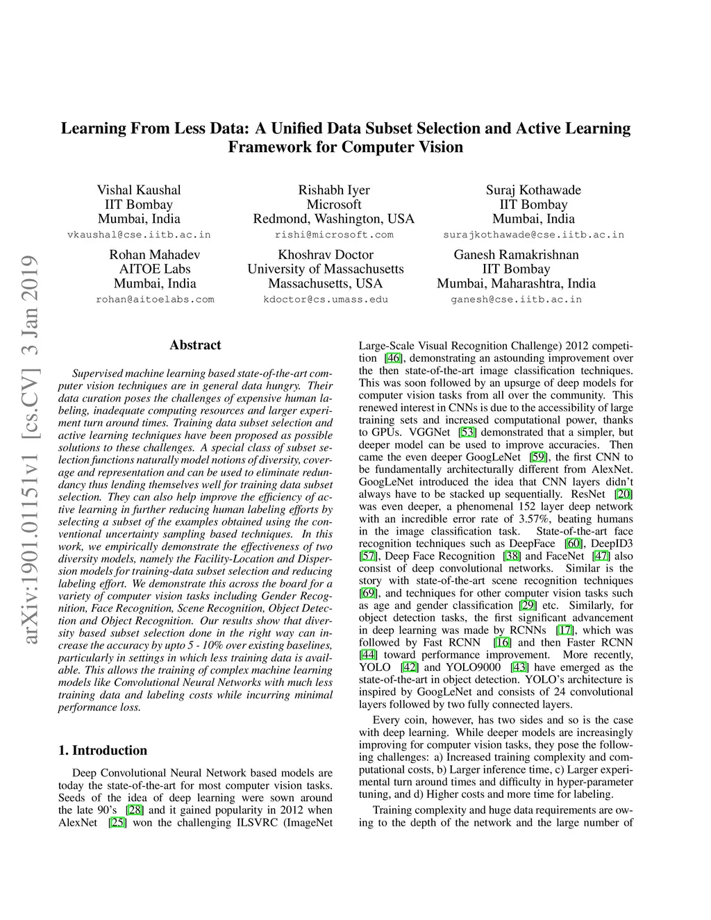 Supervised machine learning based state-of-the-art computer vision techniques are in general data hungry. Their data curation poses the challenges of expensive human labeling, inadequate computing resources and larger experiment turn around times. Training data subset selection and active learning techniques have been proposed as possible solutions to these challenges. A special class of subset selection functions naturally model notions of diversity, coverage and representation and can be used to eliminate redundancy thus lending themselves well for training data subset selection. They can also help improve the efficiency of active learning in further reducing human labeling efforts by selecting a subset of the examples obtained using the conventional uncertainty sampling based techniques. In this work, we empirically demonstrate the effectiveness of two diversity models, namely the Facility-Location and Dispersion models for training-data subset selection and reducing labeling effort. We demonstrate this across the board for a variety of computer vision tasks including Gender Recognition, Face Recognition, Scene Recognition, Object Detection and Object Recognition. Our results show that diversity based subset selection done in the right way can increase the accuracy by upto 5 - 10% over existing baselines, particularly in settings in which less training data is available. This allows the training of complex machine learning models like Convolutional Neural Networks with much less training data and labeling costs while incurring minimal performance loss.