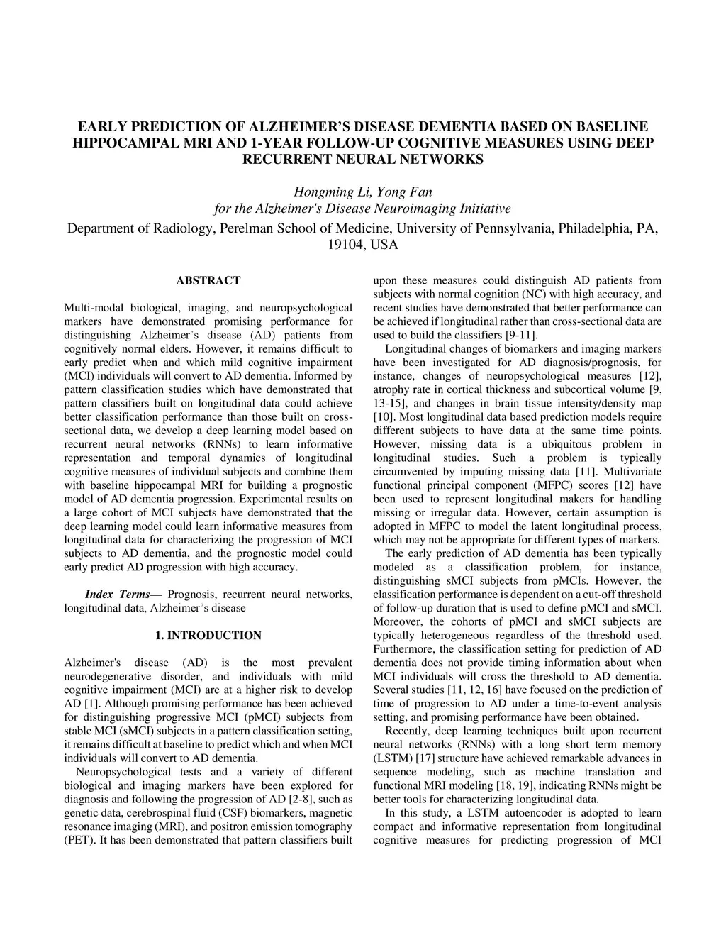 Hippocampal MRI and 1-Year Follow-Up Cognitive Measures Using Deep Recurrent
