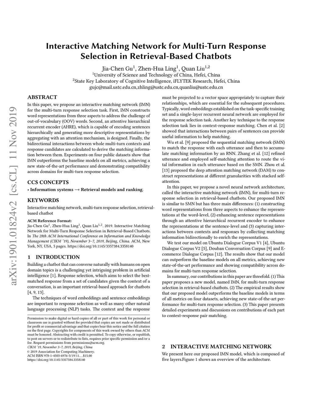 In this paper, we propose an interactive matching network (IMN) for the multi-turn response selection task. First, IMN constructs word representations from three aspects to address the challenge of out-of-vocabulary (OOV) words. Second, an attentive hierarchical recurrent encoder (AHRE), which is capable of encoding sentences hierarchically and generating more descriptive representations by aggregating with an attention mechanism, is designed. Finally, the bidirectional interactions between whole multi-turn contexts and response candidates are calculated to derive the matching information between them. Experiments on four public datasets show that IMN outperforms the baseline models on all metrics, achieving a new state-of-the-art performance and demonstrating compatibility across domains for multi-turn response selection.