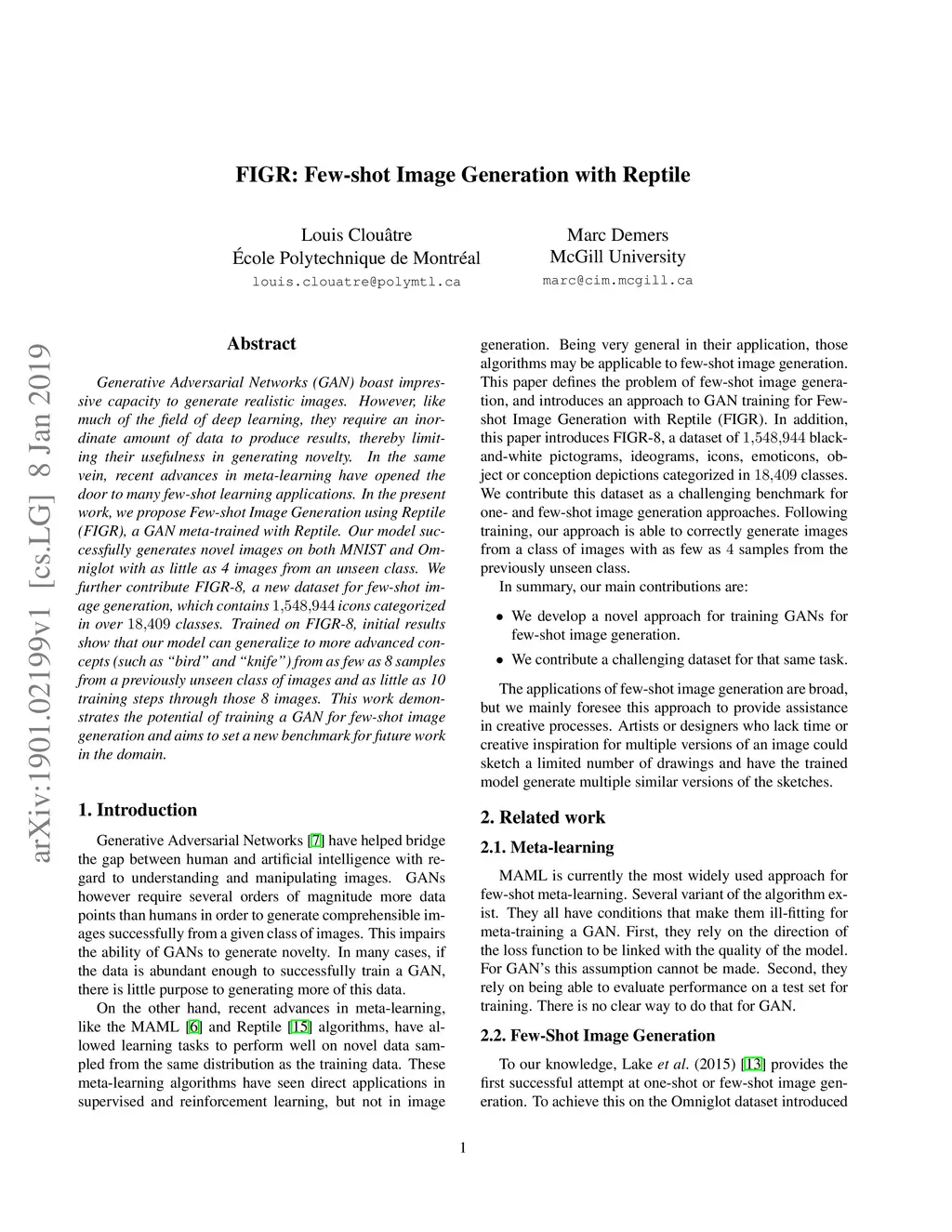 Generative Adversarial Networks (GAN) boast impressive capacity to generate realistic images. However, like much of the field of deep learning, they require an inordinate amount of data to produce results, thereby limiting their usefulness in generating novelty. In the same vein, recent advances in meta-learning have opened the door to many few-shot learning applications. In the present work, we propose Few-shot Image Generation using Reptile (FIGR), a GAN meta-trained with Reptile. Our model successfully generates novel images on both MNIST and Omniglot with as little as 4 images from an unseen class. We further contribute FIGR-8, a new dataset for few-shot image generation, which contains 1,548,944 icons categorized in over 18,409 classes. Trained on FIGR-8, initial results show that our model can generalize to more advanced concepts (such as "bird" and "knife") from as few as 8 samples from a previously unseen class of images and as little as 10 training steps through those 8 images. This work demonstrates the potential of training a GAN for few-shot image generation and aims to set a new benchmark for future work in the domain.