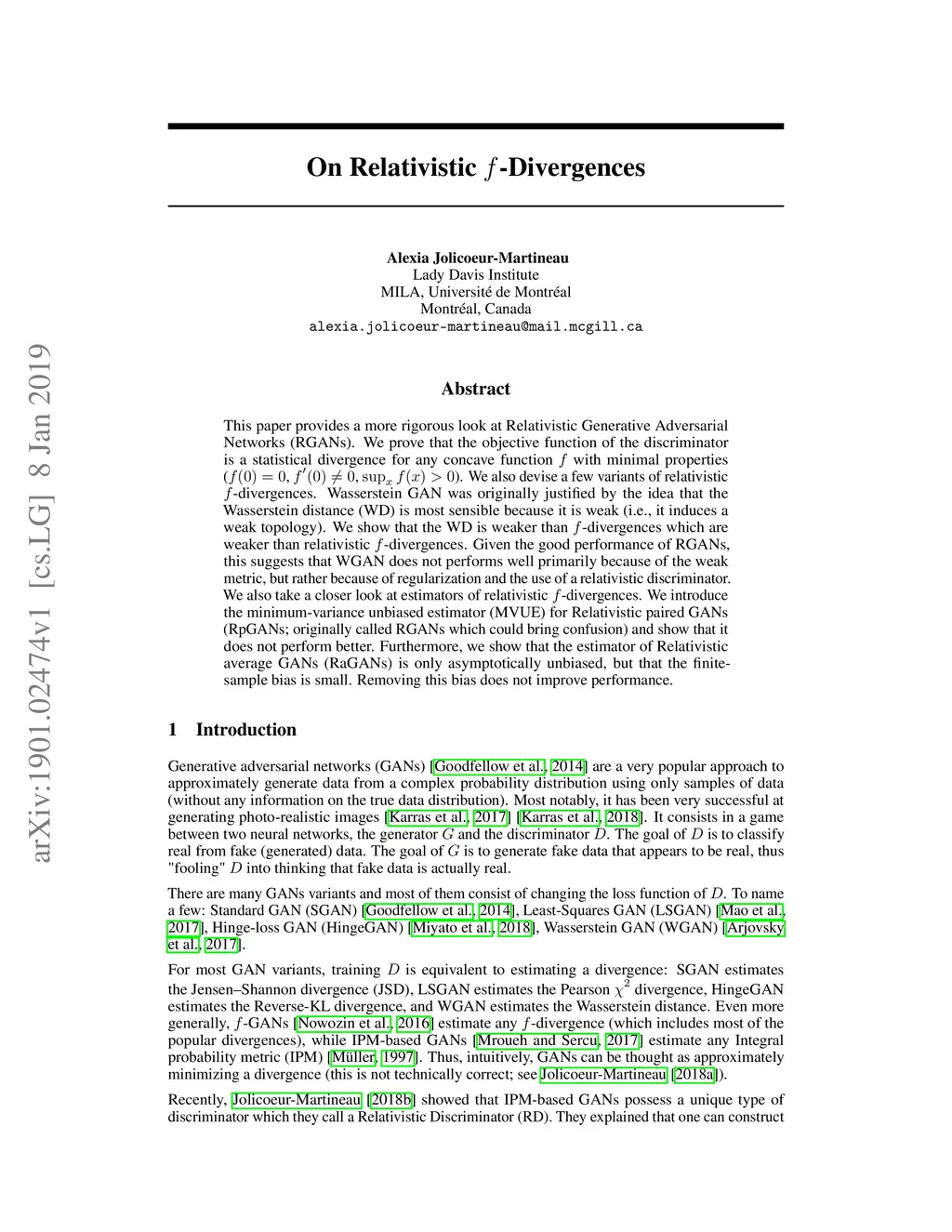 This paper provides a more rigorous look at Relativistic Generative Adversarial Networks (RGANs). We prove that the objective function of the discriminator is a statistical divergence for any concave function with minimal properties (, , ). We also devise a few variants of relativistic -divergences. Wasserstein GAN was originally justified by the idea that the Wasserstein distance (WD) is most sensible because it is weak (i.e., it induces a weak topology). We show that the WD is weaker than -divergences which are weaker than relativistic -divergences. Given the good performance of RGANs, this suggests that WGAN does not performs well primarily because of the weak metric, but rather because of regularization and the use of a relativistic discriminator. We also take a closer look at estimators of relativistic -divergences. We introduce the minimum-variance unbiased estimator (MVUE) for Relativistic paired GANs (RpGANs; originally called RGANs which could bring confusion) and show that it does not perform better. Furthermore, we show that the estimator of Relativistic average GANs (RaGANs) is only asymptotically unbiased, but that the finite-sample bias is small. Removing this bias does not improve performance.