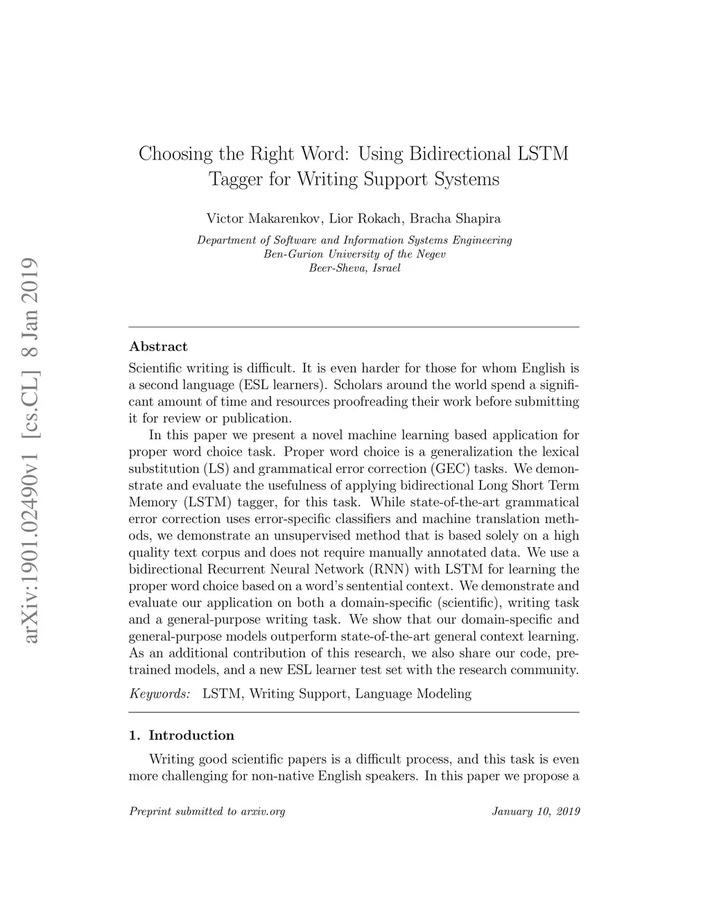 Scientific writing is difficult. It is even harder for those for whom English is a second language (ESL learners). Scholars around the world spend a significant amount of time and resources proofreading their work before submitting it for review or publication. In this paper we present a novel machine learning based application for proper word choice task. Proper word choice is a generalization the lexical substitution (LS) and grammatical error correction (GEC) tasks. We demonstrate and evaluate the usefulness of applying bidirectional Long Short Term Memory (LSTM) tagger, for this task. While state-of-the-art grammatical error correction uses error-specific classifiers and machine translation methods, we demonstrate an unsupervised method that is based solely on a high quality text corpus and does not require manually annotated data. We use a bidirectional Recurrent Neural Network (RNN) with LSTM for learning the proper word choice based on a word's sentential context. We demonstrate and evaluate our application on both a domain-specific (scientific), writing task and a general-purpose writing task. We show that our domain-specific and general-purpose models outperform state-of-the-art general context learning. As an additional contribution of this research, we also share our code, pre-trained models, and a new ESL learner test set with the research community.