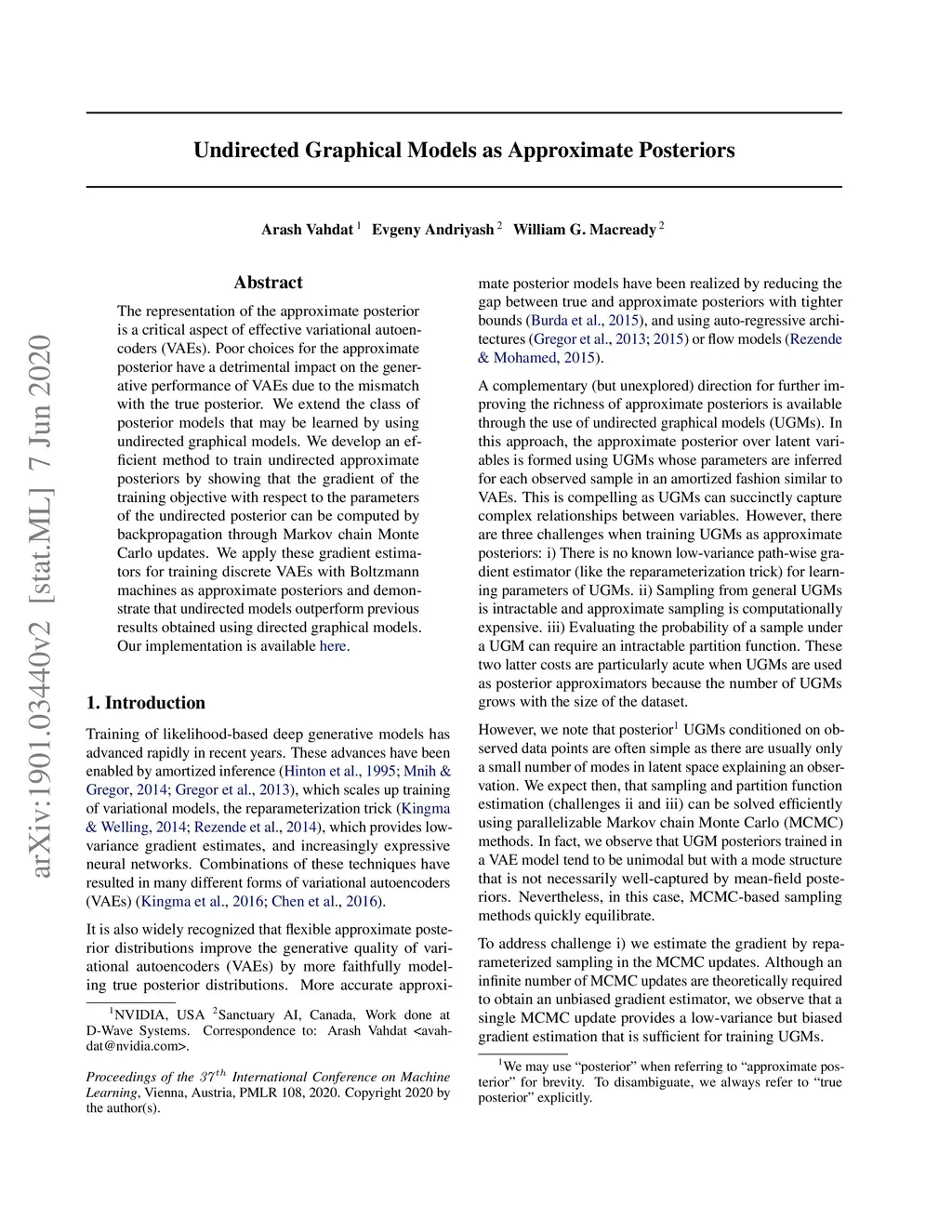 The representation of the approximate posterior is a critical aspect of effective variational autoencoders (VAEs). Poor choices for the approximate posterior have a detrimental impact on the generative performance of VAEs due to the mismatch with the true posterior. We extend the class of posterior models that may be learned by using undirected graphical models. We develop an efficient method to train undirected approximate posteriors by showing that the gradient of the training objective with respect to the parameters of the undirected posterior can be computed by backpropagation through Markov chain Monte Carlo updates. We apply these gradient estimators for training discrete VAEs with Boltzmann machines as approximate posteriors and demonstrate that undirected models outperform previous results obtained using directed graphical models. Our implementation is available at https://github.com/QuadrantAI/dvaess .