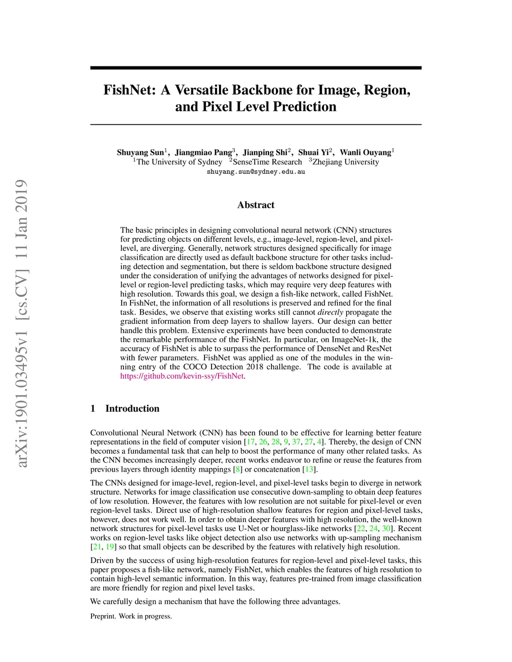 The basic principles in designing convolutional neural network (CNN) structures for predicting objects on different levels, e.g., image-level, region-level, and pixel-level are diverging. Generally, network structures designed specifically for image classification are directly used as default backbone structure for other tasks including detection and segmentation, but there is seldom backbone structure designed under the consideration of unifying the advantages of networks designed for pixel-level or region-level predicting tasks, which may require very deep features with high resolution. Towards this goal, we design a fish-like network, called FishNet. In FishNet, the information of all resolutions is preserved and refined for the final task. Besides, we observe that existing works still cannot \emph{directly} propagate the gradient information from deep layers to shallow layers. Our design can better handle this problem. Extensive experiments have been conducted to demonstrate the remarkable performance of the FishNet. In particular, on ImageNet-1k, the accuracy of FishNet is able to surpass the performance of DenseNet and ResNet with fewer parameters. FishNet was applied as one of the modules in the winning entry of the COCO Detection 2018 challenge. The code is available at https://github.com/kevin-ssy/FishNet.