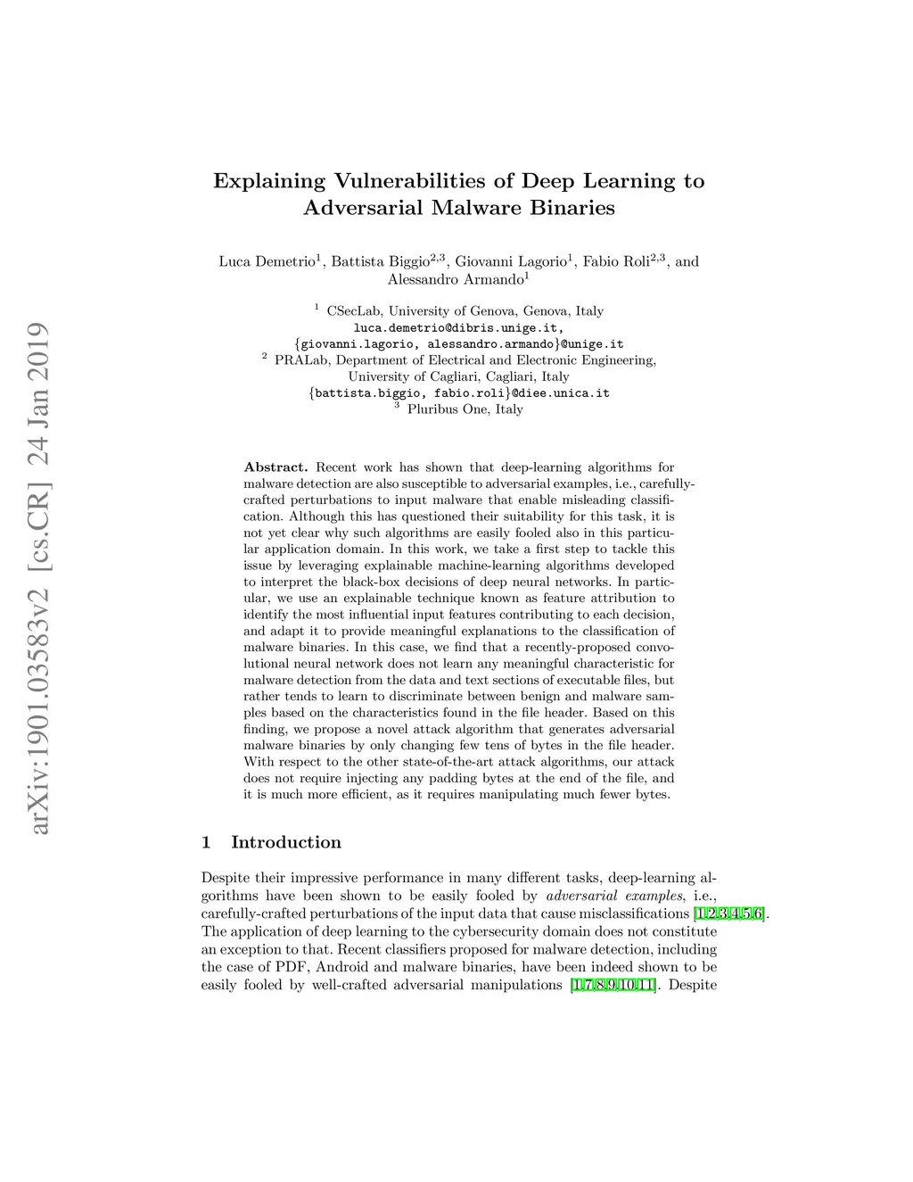 Recent work has shown that deep-learning algorithms for malware detection are also susceptible to adversarial examples, i.e., carefully-crafted perturbations to input malware that enable misleading classification. Although this has questioned their suitability for this task, it is not yet clear why such algorithms are easily fooled also in this particular application domain. In this work, we take a first step to tackle this issue by leveraging explainable machine-learning algorithms developed to interpret the black-box decisions of deep neural networks. In particular, we use an explainable technique known as feature attribution to identify the most influential input features contributing to each decision, and adapt it to provide meaningful explanations to the classification of malware binaries. In this case, we find that a recently-proposed convolutional neural network does not learn any meaningful characteristic for malware detection from the data and text sections of executable files, but rather tends to learn to discriminate between benign and malware samples based on the characteristics found in the file header. Based on this finding, we propose a novel attack algorithm that generates adversarial malware binaries by only changing few tens of bytes in the file header. With respect to the other state-of-the-art attack algorithms, our attack does not require injecting any padding bytes at the end of the file, and it is much more efficient, as it requires manipulating much fewer bytes.