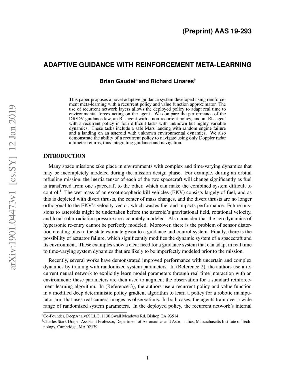 This paper proposes a novel adaptive guidance system developed using reinforcement meta-learning with a recurrent policy and value function approximator. The use of recurrent network layers allows the deployed policy to adapt real time to environmental forces acting on the agent. We compare the performance of the DR/DV guidance law, an RL agent with a non-recurrent policy, and an RL agent with a recurrent policy in four difficult tasks with unknown but highly variable dynamics. These tasks include a safe Mars landing with random engine failure and a landing on an asteroid with unknown environmental dynamics. We also demonstrate the ability of a recurrent policy to navigate using only Doppler radar altimeter returns, thus integrating guidance and navigation.