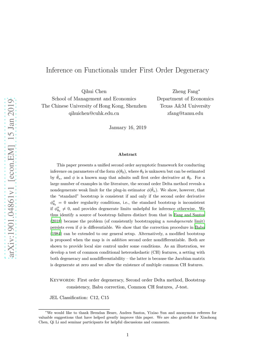 This paper presents a unified second order asymptotic framework for conducting inference on parameters of the form , where is unknown but can be estimated by , and is a known map that admits null first order derivative at . For a large number of examples in the literature, the second order Delta method reveals a nondegenerate weak limit for the plug-in estimator . We show, however, that the `standard' bootstrap is consistent if and only if the second order derivative under regularity conditions, i.e., the standard bootstrap is inconsistent if , and provides degenerate limits unhelpful for inference otherwise. We thus identify a source of bootstrap failures distinct from that in Fang and Santos (2018) because the problem (of consistently bootstrapping a \textit{nondegenerate} limit) persists even if is differentiable. We show that the correction procedure in Babu (1984) can be extended to our general setup. Alternatively, a modified bootstrap is proposed when the map is \textit{in addition} second order nondifferentiable. Both are shown to provide local size control under some conditions. As an illustration, we develop a test of common conditional heteroskedastic (CH) features, a setting with both degeneracy and nondifferentiability -- the latter is because the Jacobian matrix is degenerate at zero and we allow the existence of multiple common CH features.