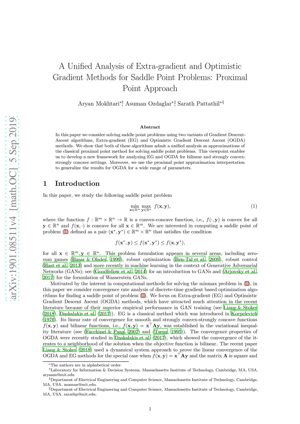 A Unified Analysis of Extra-gradient and Optimistic Gradient Methods for