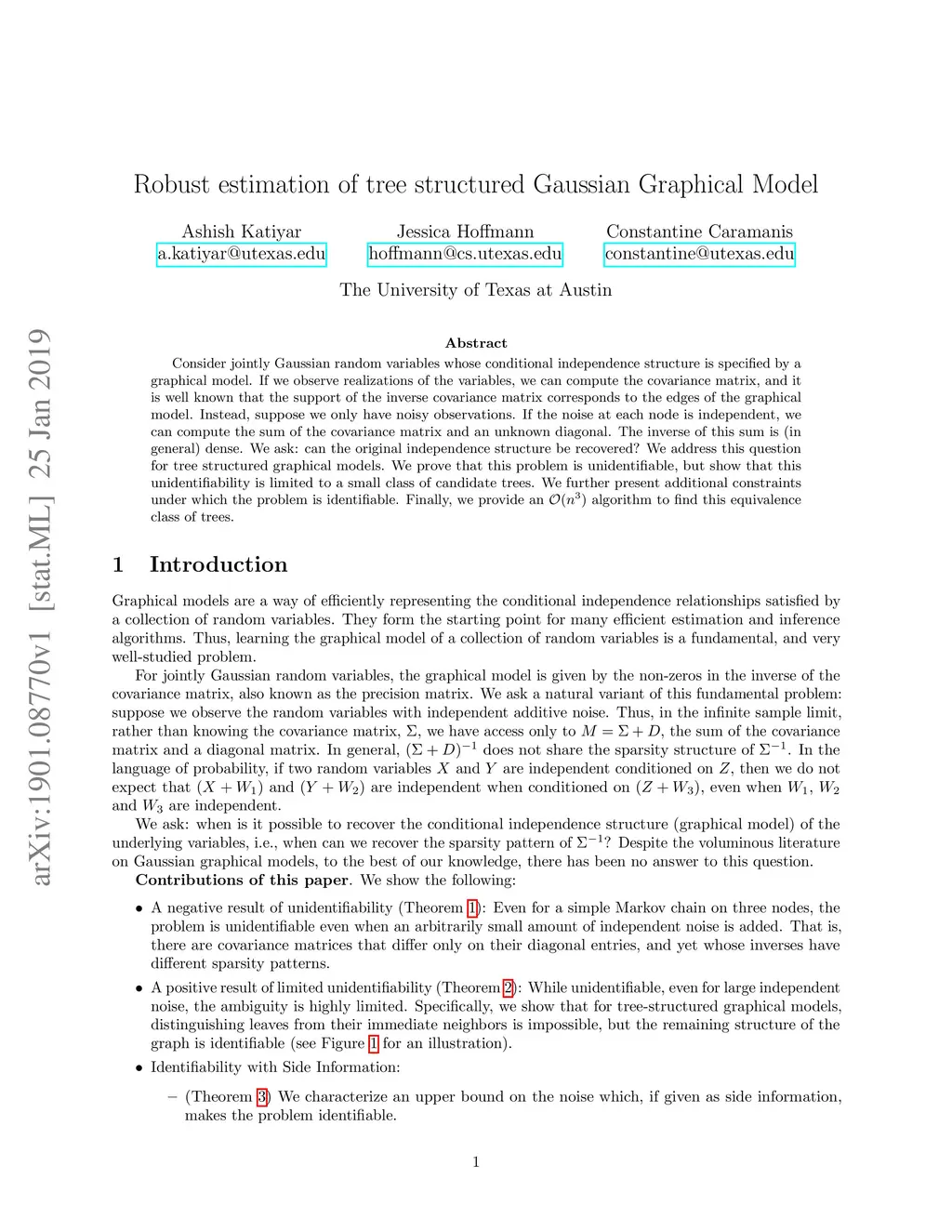 Consider jointly Gaussian random variables whose conditional independence structure is specified by a graphical model. If we observe realizations of the variables, we can compute the covariance matrix, and it is well known that the support of the inverse covariance matrix corresponds to the edges of the graphical model. Instead, suppose we only have noisy observations. If the noise at each node is independent, we can compute the sum of the covariance matrix and an unknown diagonal. The inverse of this sum is (in general) dense. We ask: can the original independence structure be recovered? We address this question for tree structured graphical models. We prove that this problem is unidentifiable, but show that this unidentifiability is limited to a small class of candidate trees. We further present additional constraints under which the problem is identifiable. Finally, we provide an O(n^3) algorithm to find this equivalence class of trees.