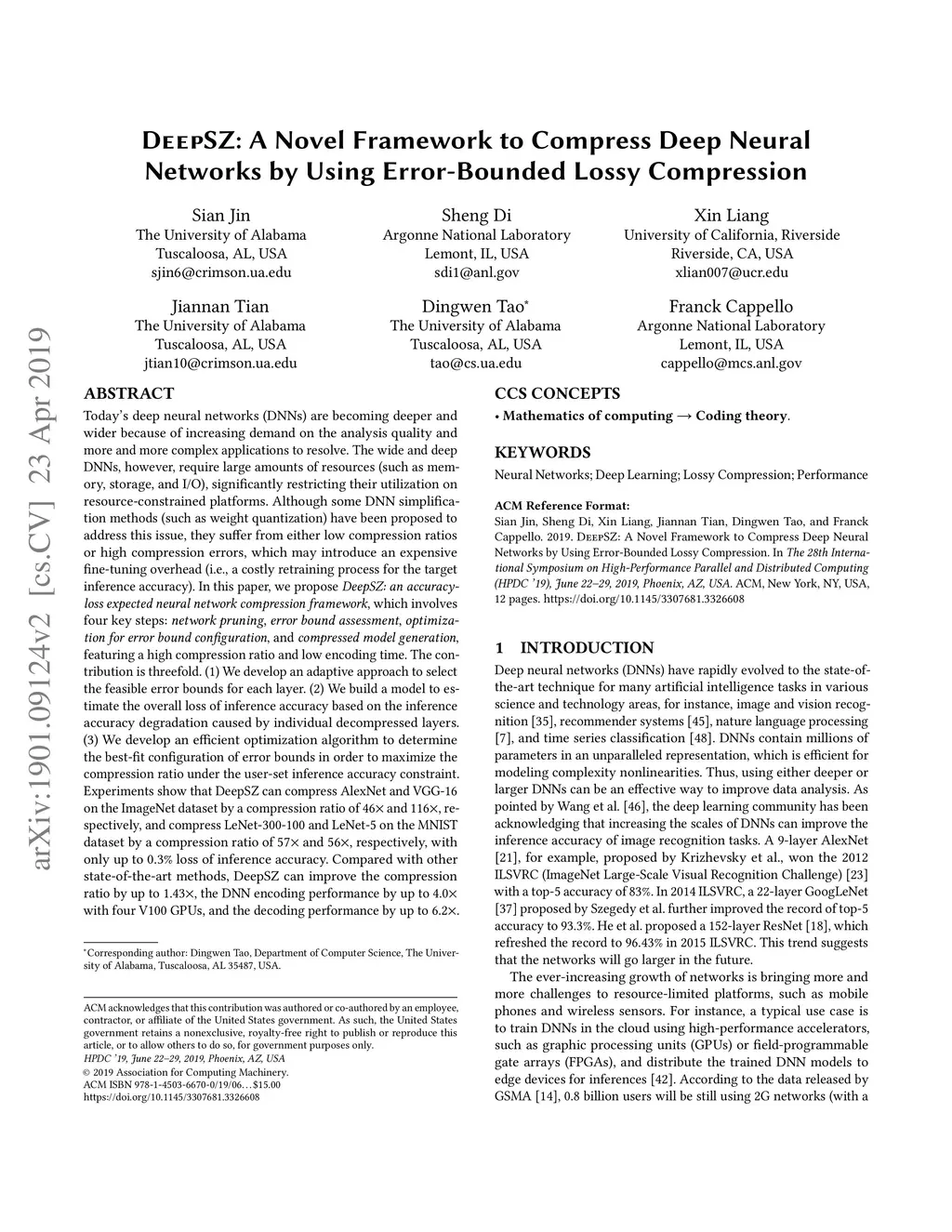 DeepSZ: A Novel Framework to Compress Deep Neural Networks by Using