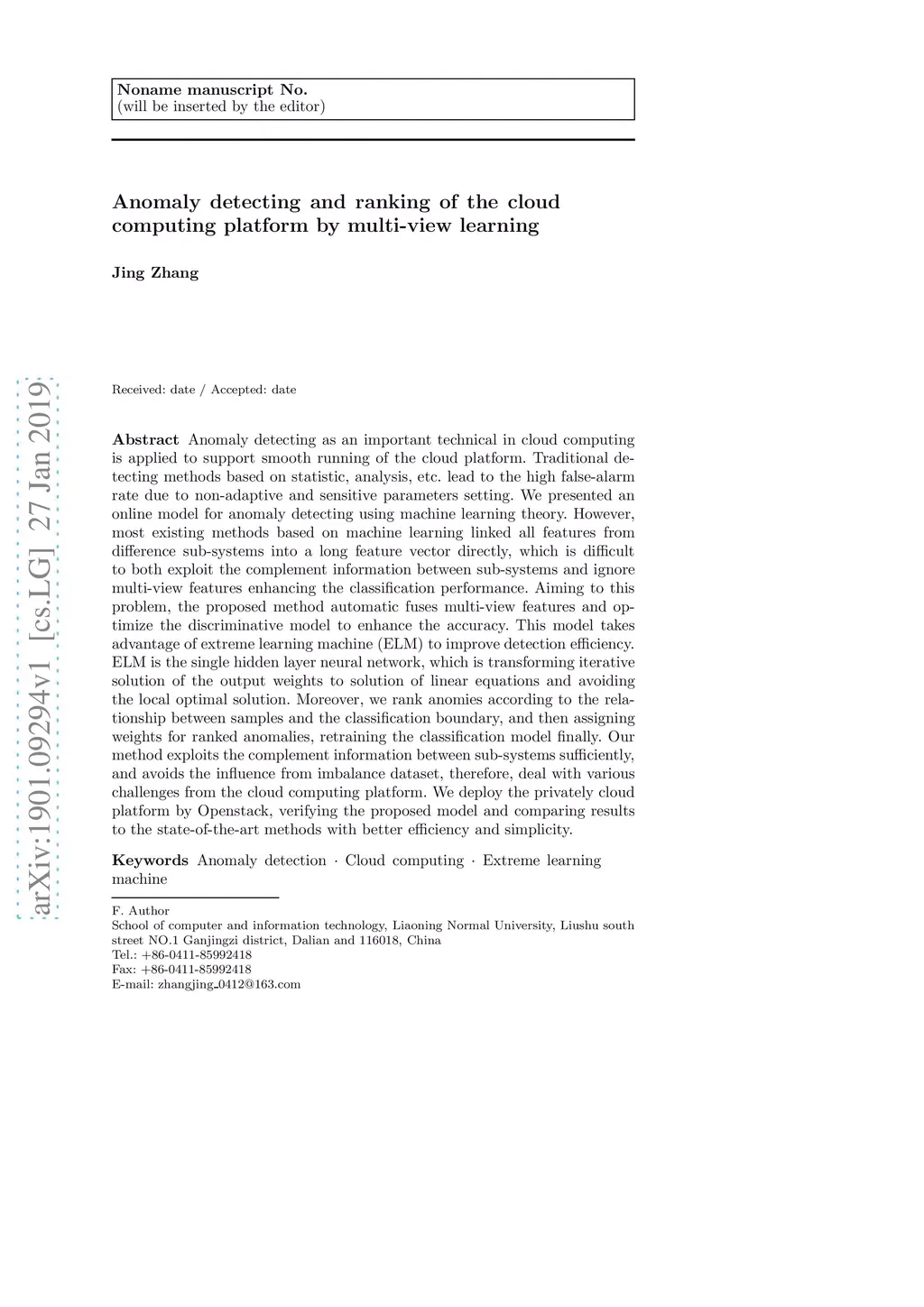 Anomaly detecting as an important technical in cloud computing is applied to support smooth running of the cloud platform. Traditional detecting methods based on statistic, analysis, etc. lead to the high false-alarm rate due to non-adaptive and sensitive parameters setting. We presented an online model for anomaly detecting using machine learning theory. However, most existing methods based on machine learning linked all features from difference sub-systems into a long feature vector directly, which is difficult to both exploit the complement information between sub-systems and ignore multi-view features enhancing the classification performance. Aiming to this problem, the proposed method automatic fuses multi-view features and optimize the discriminative model to enhance the accuracy. This model takes advantage of extreme learning machine (ELM) to improve detection efficiency. ELM is the single hidden layer neural network, which is transforming iterative solution the output weights to solution of linear equations and avoiding the local optimal solution. Moreover, we rank anomies according to the relationship between samples and the classification boundary, and then assigning weights for ranked anomalies, retraining the classification model finally. Our method exploits the complement information between sub-systems sufficiently, and avoids the influence from imbalance dataset, therefore, deal with various challenges from the cloud computing platform. We deploy the privately cloud platform by Openstack, verifying the proposed model and comparing results to the state-of-the-art methods with better efficiency and simplicity.