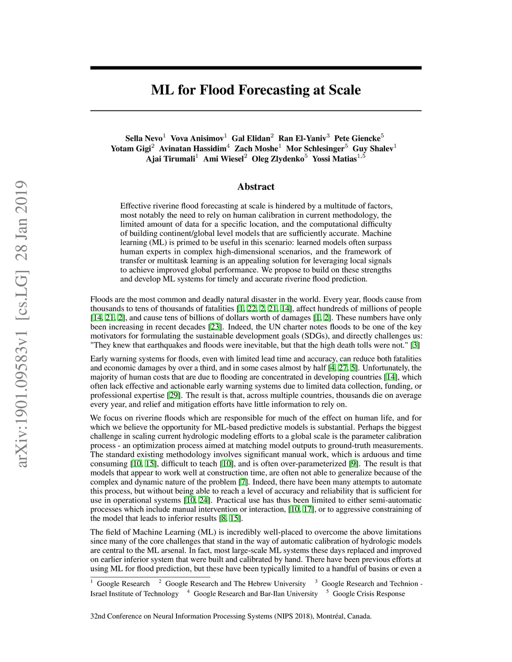 Effective riverine flood forecasting at scale is hindered by a multitude of factors, most notably the need to rely on human calibration in current methodology, the limited amount of data for a specific location, and the computational difficulty of building continent/global level models that are sufficiently accurate. Machine learning (ML) is primed to be useful in this scenario: learned models often surpass human experts in complex high-dimensional scenarios, and the framework of transfer or multitask learning is an appealing solution for leveraging local signals to achieve improved global performance. We propose to build on these strengths and develop ML systems for timely and accurate riverine flood prediction.