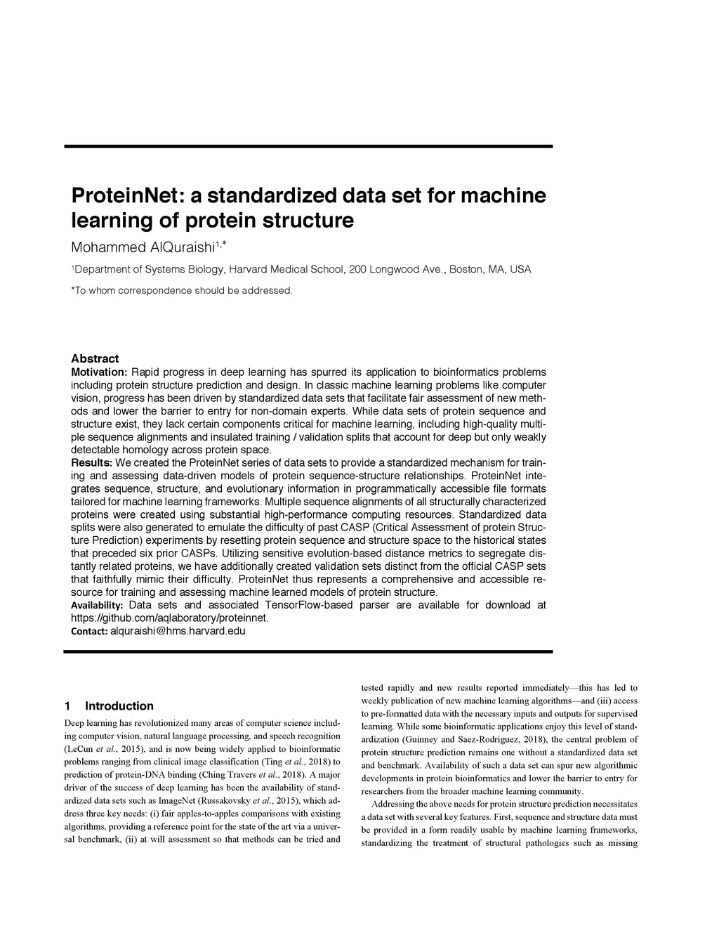 Rapid progress in deep learning has spurred its application to bioinformatics problems including protein structure prediction and design. In classic machine learning problems like computer vision, progress has been driven by standardized data sets that facilitate fair assessment of new methods and lower the barrier to entry for non-domain experts. While data sets of protein sequence and structure exist, they lack certain components critical for machine learning, including high-quality multiple sequence alignments and insulated training / validation splits that account for deep but only weakly detectable homology across protein space. We have created the ProteinNet series of data sets to provide a standardized mechanism for training and assessing data-driven models of protein sequence-structure relationships. ProteinNet integrates sequence, structure, and evolutionary information in programmatically accessible file formats tailored for machine learning frameworks. Multiple sequence alignments of all structurally characterized proteins were created using substantial high-performance computing resources. Standardized data splits were also generated to emulate the difficulty of past CASP (Critical Assessment of protein Structure Prediction) experiments by resetting protein sequence and structure space to the historical states that preceded six prior CASPs. Utilizing sensitive evolution-based distance metrics to segregate distantly related proteins, we have additionally created validation sets distinct from the official CASP sets that faithfully mimic their difficulty. ProteinNet thus represents a comprehensive and accessible resource for training and assessing machine-learned models of protein structure.