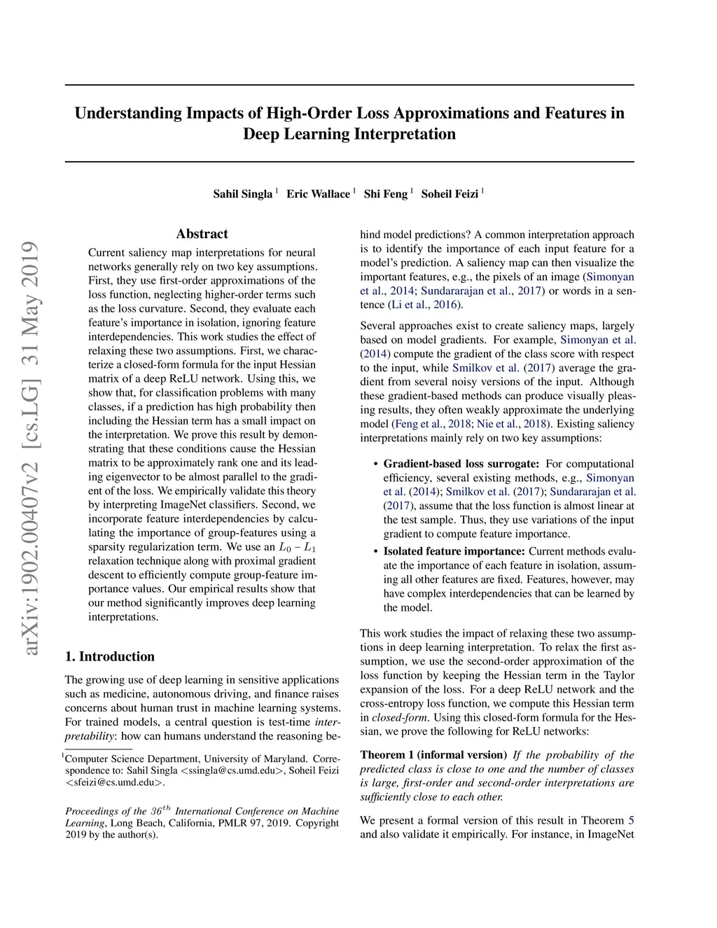 Current methods to interpret deep learning models by generating saliency maps generally rely on two key assumptions. First, they use first-order approximations of the loss function neglecting higher-order terms such as the loss curvatures. Second, they evaluate each feature's importance in isolation, ignoring their inter-dependencies. In this work, we study the effect of relaxing these two assumptions. First, by characterizing a closed-form formula for the Hessian matrix of a deep ReLU network, we prove that, for a classification problem with a large number of classes, if an input has a high confidence classification score, the inclusion of the Hessian term has small impacts in the final solution. We prove this result by showing that in this case the Hessian matrix is approximately of rank one and its leading eigenvector is almost parallel to the gradient of the loss function. Our empirical experiments on ImageNet samples are consistent with our theory. This result can have implications in other related problems such as adversarial examples as well. Second, we compute the importance of group-features in deep learning interpretation by introducing a sparsity regularization term. We use the relaxation technique along with the proximal gradient descent to have an efficient computation of group feature importance scores. Our empirical results indicate that considering group features can improve deep learning interpretation significantly.