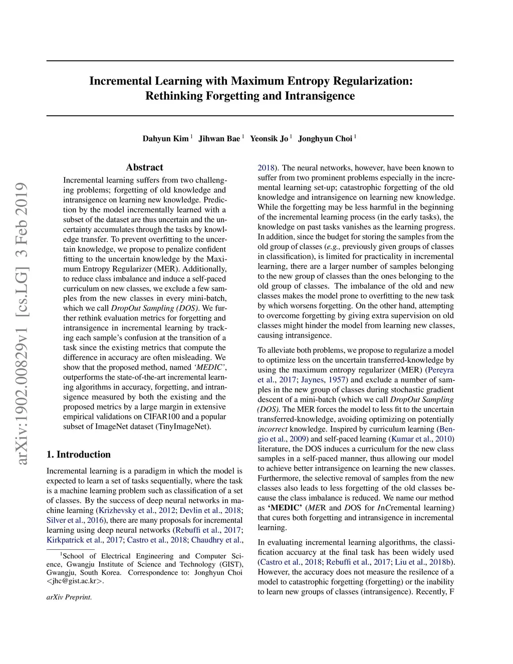 Incremental learning suffers from two challenging problems; forgetting of old knowledge and intransigence on learning new knowledge. Prediction by the model incrementally learned with a subset of the dataset are thus uncertain and the uncertainty accumulates through the tasks by knowledge transfer. To prevent overfitting to the uncertain knowledge, we propose to penalize confident fitting to the uncertain knowledge by the Maximum Entropy Regularizer (MER). Additionally, to reduce class imbalance and induce a self-paced curriculum on new classes, we exclude a few samples from the new classes in every mini-batch, which we call DropOut Sampling (DOS). We further rethink evaluation metrics for forgetting and intransigence in incremental learning by tracking each sample's confusion at the transition of a task since the existing metrics that compute the difference in accuracy are often misleading. We show that the proposed method, named 'MEDIC', outperforms the state-of-the-art incremental learning algorithms in accuracy, forgetting, and intransigence measured by both the existing and the proposed metrics by a large margin in extensive empirical validations on CIFAR100 and a popular subset of ImageNet dataset (TinyImageNet).