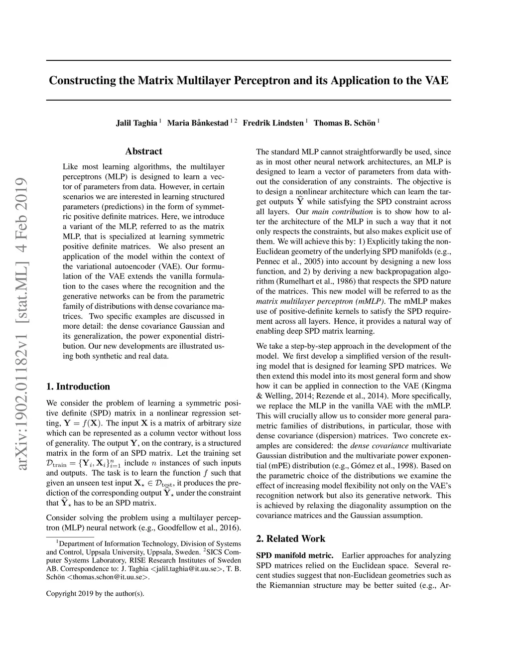 Like most learning algorithms, the multilayer perceptrons (MLP) is designed to learn a vector of parameters from data. However, in certain scenarios we are interested in learning structured parameters (predictions) in the form of symmetric positive definite matrices. Here, we introduce a variant of the MLP, referred to as the matrix MLP, that is specialized at learning symmetric positive definite matrices. We also present an application of the model within the context of the variational autoencoder (VAE). Our formulation of the VAE extends the vanilla formulation to the cases where the recognition and the generative networks can be from the parametric family of distributions with dense covariance matrices. Two specific examples are discussed in more detail: the dense covariance Gaussian and its generalization, the power exponential distribution. Our new developments are illustrated using both synthetic and real data.