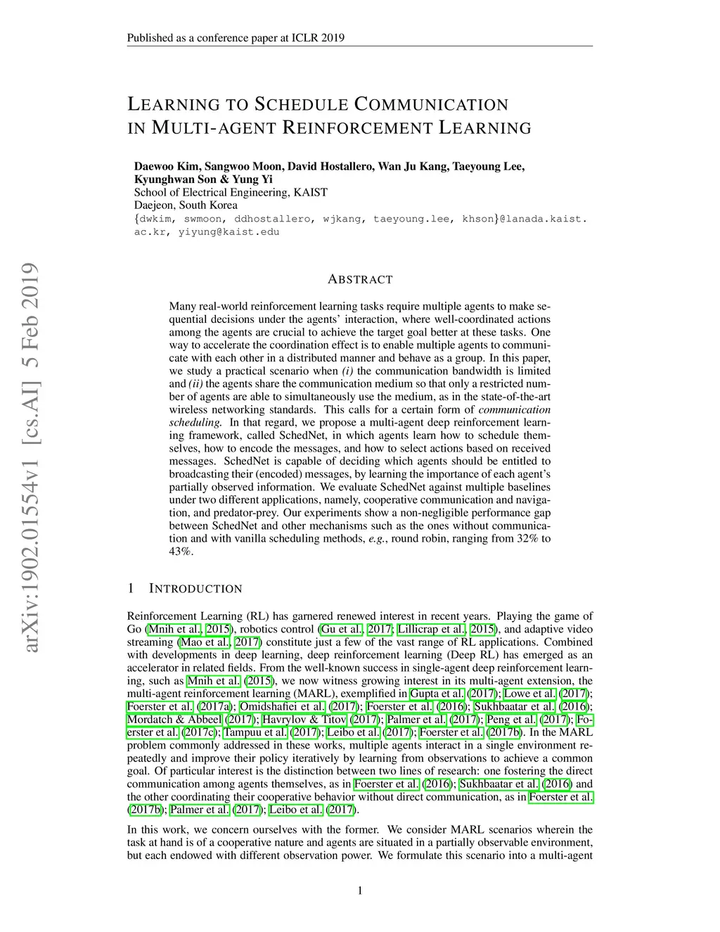 Many real-world reinforcement learning tasks require multiple agents to make sequential decisions under the agents' interaction, where well-coordinated actions among the agents are crucial to achieve the target goal better at these tasks. One way to accelerate the coordination effect is to enable multiple agents to communicate with each other in a distributed manner and behave as a group. In this paper, we study a practical scenario when (i) the communication bandwidth is limited and (ii) the agents share the communication medium so that only a restricted number of agents are able to simultaneously use the medium, as in the state-of-the-art wireless networking standards. This calls for a certain form of communication scheduling. In that regard, we propose a multi-agent deep reinforcement learning framework, called SchedNet, in which agents learn how to schedule themselves, how to encode the messages, and how to select actions based on received messages. SchedNet is capable of deciding which agents should be entitled to broadcasting their (encoded) messages, by learning the importance of each agent's partially observed information. We evaluate SchedNet against multiple baselines under two different applications, namely, cooperative communication and navigation, and predator-prey. Our experiments show a non-negligible performance gap between SchedNet and other mechanisms such as the ones without communication and with vanilla scheduling methods, e.g., round robin, ranging from 32% to 43%.