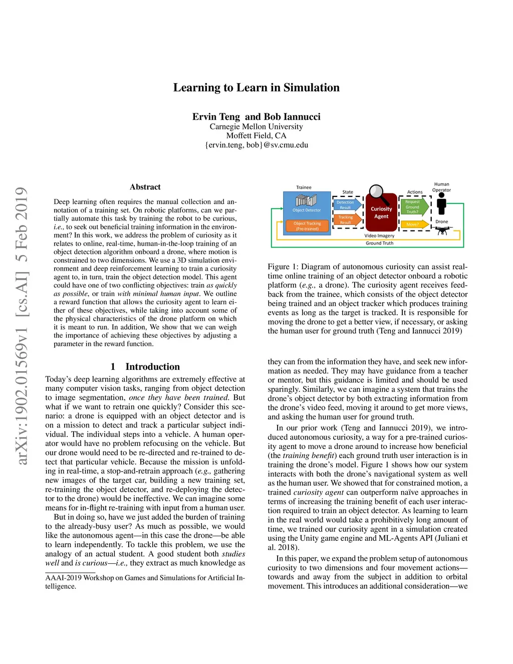 Deep learning often requires the manual collection and annotation of a training set. On robotic platforms, can we partially automate this task by training the robot to be curious, i.e., to seek out beneficial training information in the environment? In this work, we address the problem of curiosity as it relates to online, real-time, human-in-the-loop training of an object detection algorithm onboard a drone, where motion is constrained to two dimensions. We use a 3D simulation environment and deep reinforcement learning to train a curiosity agent to, in turn, train the object detection model. This agent could have one of two conflicting objectives: train as quickly as possible, or train with minimal human input. We outline a reward function that allows the curiosity agent to learn either of these objectives, while taking into account some of the physical characteristics of the drone platform on which it is meant to run. In addition, We show that we can weigh the importance of achieving these objectives by adjusting a parameter in the reward function.