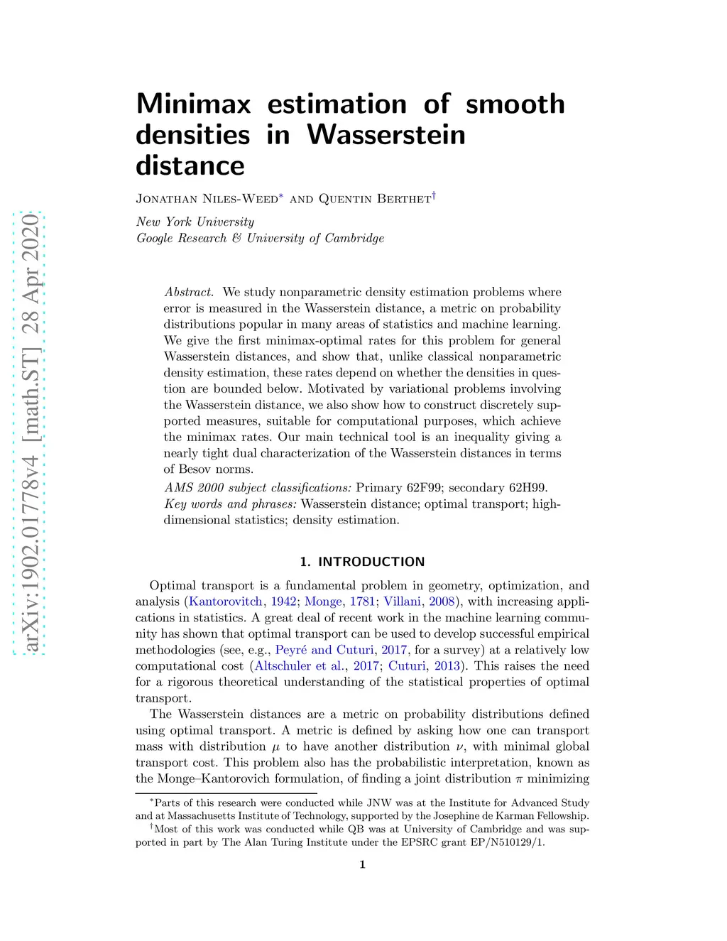 We study nonparametric density estimation problems where error is measured in the Wasserstein distance, a metric on probability distributions popular in many areas of statistics and machine learning. We give the first minimax-optimal rates for this problem for general Wasserstein distances, and show that, unlike classical nonparametric density estimation, these rates depend on whether the densities in question are bounded below. Motivated by variational problems involving the Wasserstein distance, we also show how to construct discretely supported measures, suitable for computational purposes, which achieve the minimax rates. Our main technical tool is an inequality giving a nearly tight dual characterization of the Wasserstein distances in terms of Besov norms.