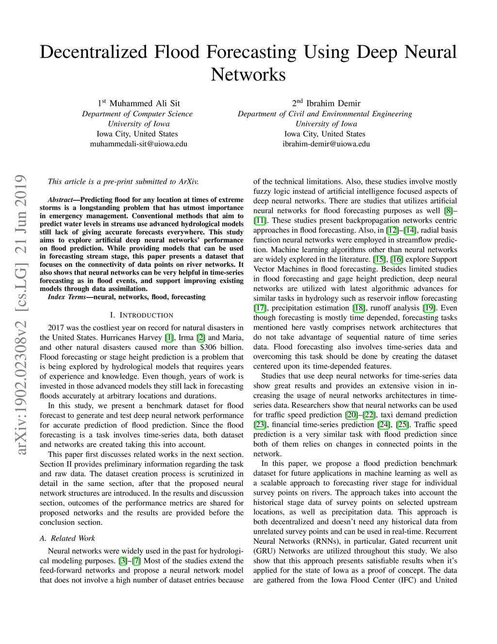 Predicting flood for any location at times of extreme storms is a longstanding problem that has utmost importance in emergency management. Conventional methods that aim to predict water levels in streams use advanced hydrological models still lack of giving accurate forecasts everywhere. This study aims to explore artificial deep neural networks' performance on flood prediction. While providing models that can be used in forecasting stream stage, this paper presents a dataset that focuses on the connectivity of data points on river networks. It also shows that neural networks can be very helpful in time-series forecasting as in flood events, and support improving existing models through data assimilation.