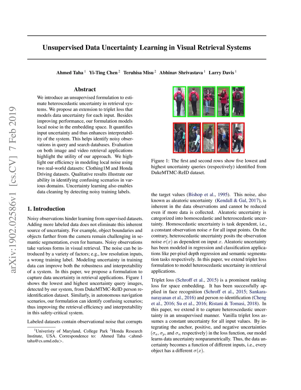 We introduce an unsupervised formulation to estimate heteroscedastic uncertainty in retrieval systems. We propose an extension to triplet loss that models data uncertainty for each input. Besides improving performance, our formulation models local noise in the embedding space. It quantifies input uncertainty and thus enhances interpretability of the system. This helps identify noisy observations in query and search databases. Evaluation on both image and video retrieval applications highlight the utility of our approach. We highlight our efficiency in modeling local noise using two real-world datasets: Clothing1M and Honda Driving datasets. Qualitative results illustrate our ability in identifying confusing scenarios in various domains. Uncertainty learning also enables data cleaning by detecting noisy training labels.