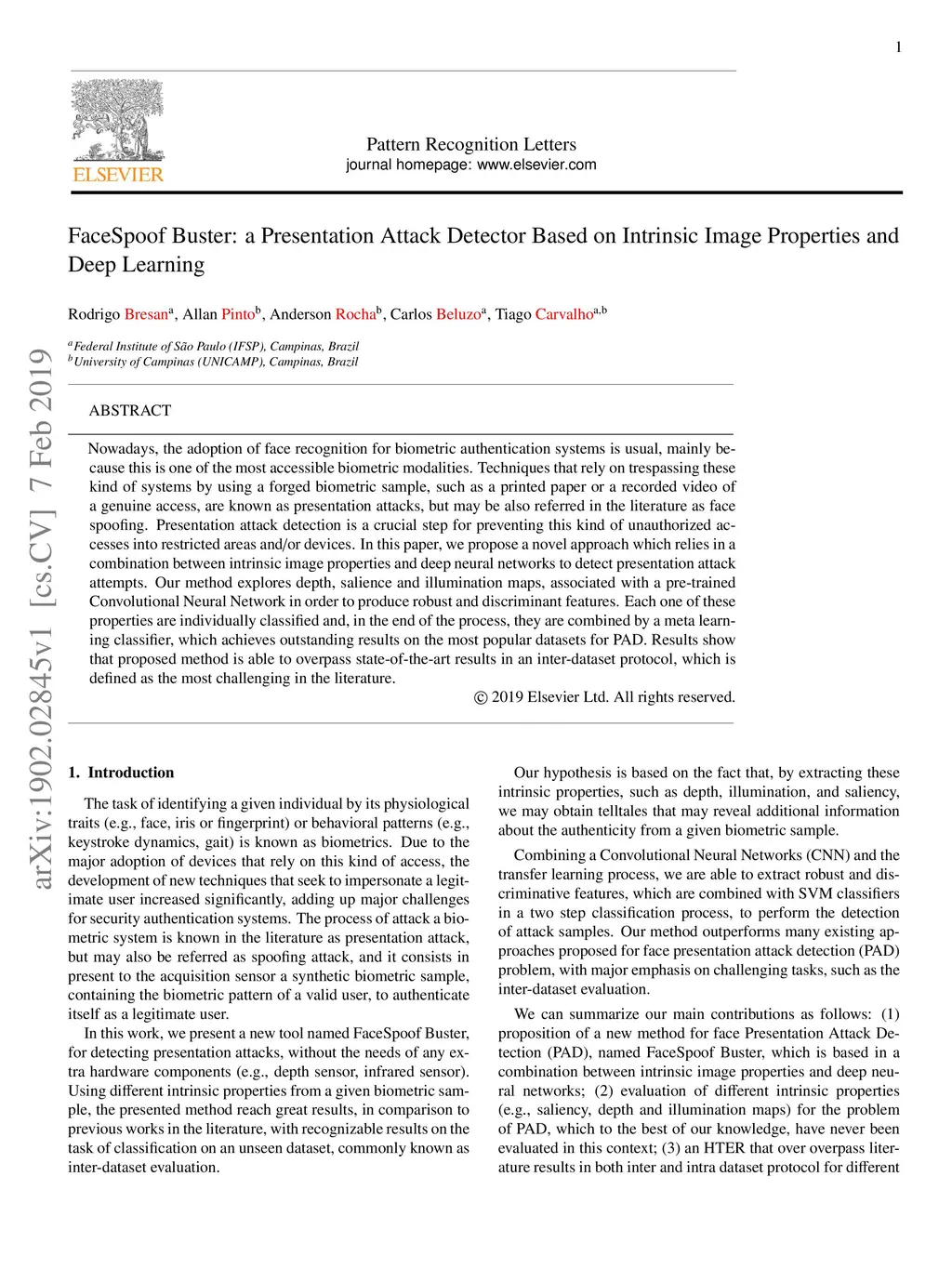 FaceSpoof Buster: a Presentation Attack Detector Based on Intrinsic