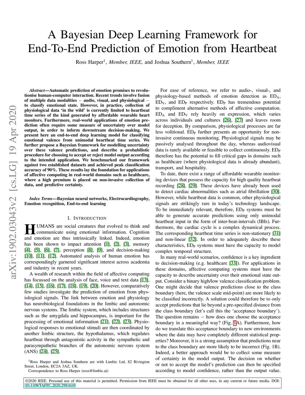 Automatic prediction of emotion promises to revolutionise human-computer interaction. Recent trends involve fusion of multiple data modalities - audio, visual, and physiological - to classify emotional state. However, in practice, collection of physiological data `in the wild' is currently limited to heartbeat time series of the kind generated by affordable wearable heart monitors. Furthermore, real-world applications of emotion prediction often require some measure of uncertainty over model output, in order to inform downstream decision-making. We present here an end-to-end deep learning model for classifying emotional valence from unimodal heartbeat time series. We further propose a Bayesian framework for modelling uncertainty over these valence predictions, and describe a probabilistic procedure for choosing to accept or reject model output according to the intended application. We benchmarked our framework against two established datasets and achieved peak classification accuracy of 90%. These results lay the foundation for applications of affective computing in real-world domains such as healthcare, where a high premium is placed on non-invasive collection of data, and predictive certainty.
