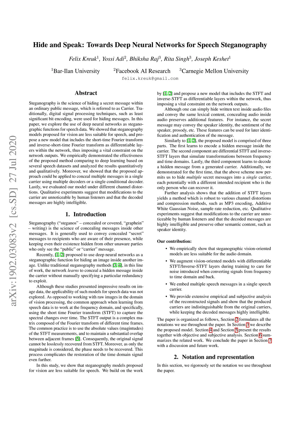 Steganography is the science of hiding a secret message within an ordinary public message, which is referred to as Carrier. Traditionally, digital signal processing techniques, such as least significant bit encoding, were used for hiding messages. In this paper, we explore the use of deep neural networks as steganographic functions for speech data. We showed that steganography models proposed for vision are less suitable for speech, and propose a new model that includes the short-time Fourier transform and inverse-short-time Fourier transform as differentiable layers within the network, thus imposing a vital constraint on the network outputs. We empirically demonstrated the effectiveness of the proposed method comparing to deep learning based on several speech datasets and analyzed the results quantitatively and qualitatively. Moreover, we showed that the proposed approach could be applied to conceal multiple messages in a single carrier using multiple decoders or a single conditional decoder. Lastly, we evaluated our model under different channel distortions. Qualitative experiments suggest that modifications to the carrier are unnoticeable by human listeners and that the decoded messages are highly intelligible.