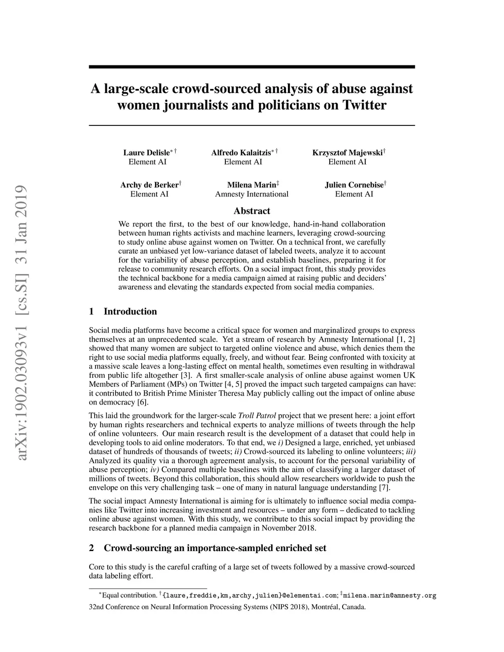 We report the first, to the best of our knowledge, hand-in-hand collaboration between human rights activists and machine learners, leveraging crowd-sourcing to study online abuse against women on Twitter. On a technical front, we carefully curate an unbiased yet low-variance dataset of labeled tweets, analyze it to account for the variability of abuse perception, and establish baselines, preparing it for release to community research efforts. On a social impact front, this study provides the technical backbone for a media campaign aimed at raising public and deciders' awareness and elevating the standards expected from social media companies.