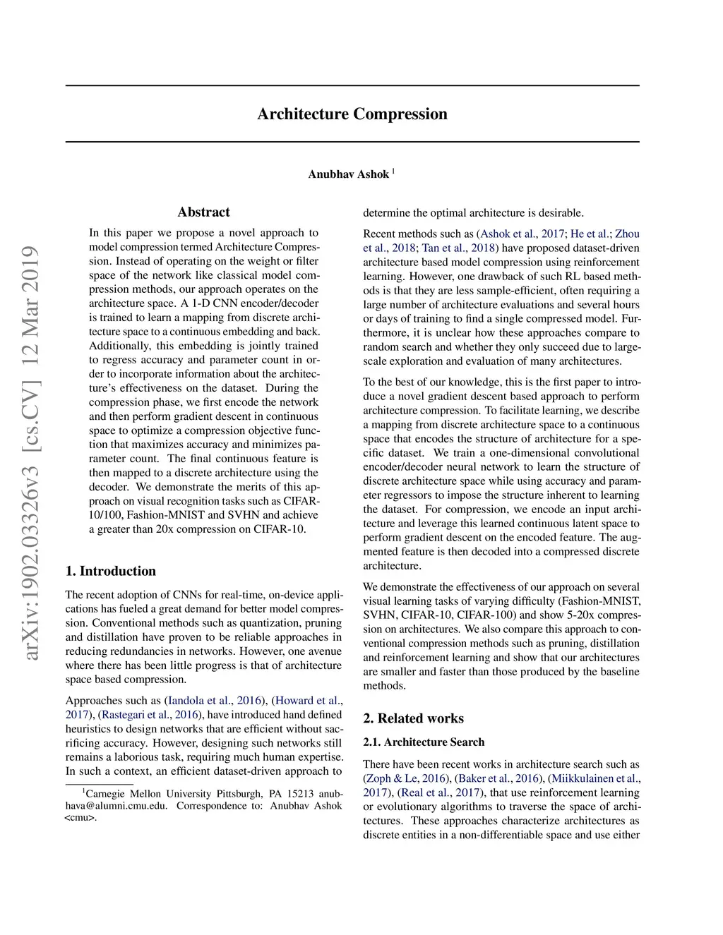 In this paper we propose a novel approach to model compression termed Architecture Compression. Instead of operating on the weight or filter space of the network like classical model compression methods, our approach operates on the architecture space. A 1-D CNN encoder-decoder is trained to learn a mapping from discrete architecture space to a continuous embedding and back. Additionally, this embedding is jointly trained to regress accuracy and parameter count in order to incorporate information about the architecture's effectiveness on the dataset. During the compression phase, we first encode the network and then perform gradient descent in continuous space to optimize a compression objective function that maximizes accuracy and minimizes parameter count. The final continuous feature is then mapped to a discrete architecture using the decoder. We demonstrate the merits of this approach on visual recognition tasks such as CIFAR-10, CIFAR-100, Fashion-MNIST and SVHN and achieve a greater than 20x compression on CIFAR-10.