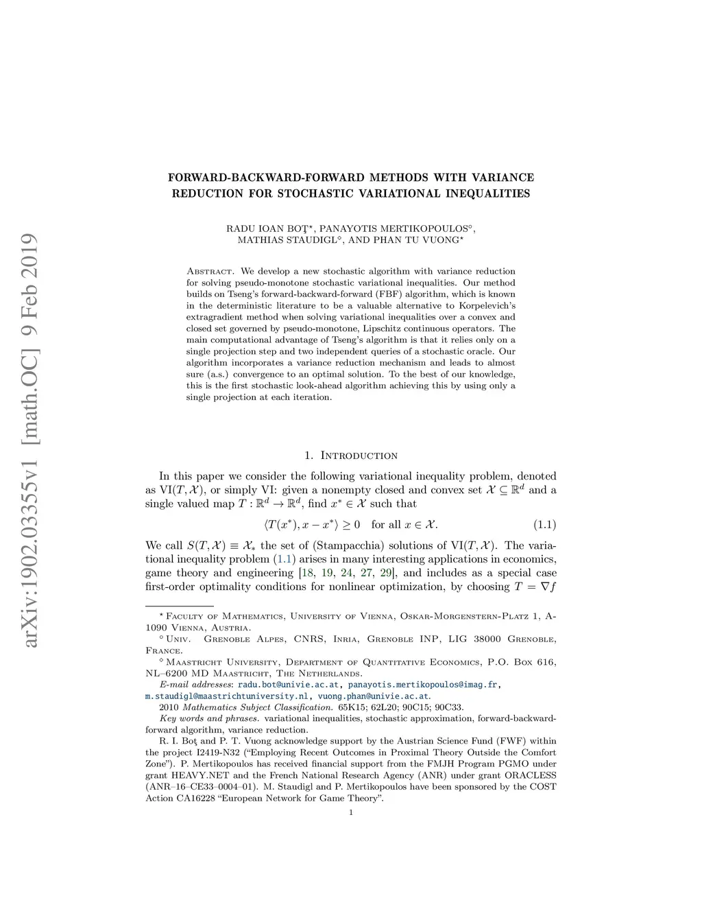 We develop a new stochastic algorithm with variance reduction for solving pseudo-monotone stochastic variational inequalities. Our method builds on Tseng's forward-backward-forward (FBF) algorithm, which is known in the deterministic literature to be a valuable alternative to Korpelevich's extragradient method when solving variational inequalities over a convex and closed set governed by pseudo-monotone, Lipschitz continuous operators. The main computational advantage of Tseng's algorithm is that it relies only on a single projection step and two independent queries of a stochastic oracle. Our algorithm incorporates a variance reduction mechanism and leads to almost sure (a.s.) convergence to an optimal solution. To the best of our knowledge, this is the first stochastic look-ahead algorithm achieving this by using only a single projection at each iteration..