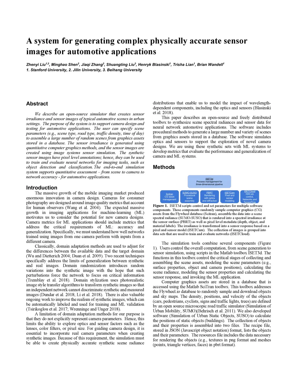 We describe an open-source simulator that creates sensor irradiance and sensor images of typical automotive scenes in urban settings. The purpose of the system is to support camera design and testing for automotive applications. The user can specify scene parameters (e.g., scene type, road type, traffic density, time of day) to assemble a large number of random scenes from graphics assets stored in a database. The sensor irradiance is generated using quantitative computer graphics methods, and the sensor images are created using image systems sensor simulation. The synthetic sensor images have pixel level annotations; hence, they can be used to train and evaluate neural networks for imaging tasks, such as object detection and classification. The end-to-end simulation system supports quantitative assessment, from scene to camera to network accuracy, for automotive applications.