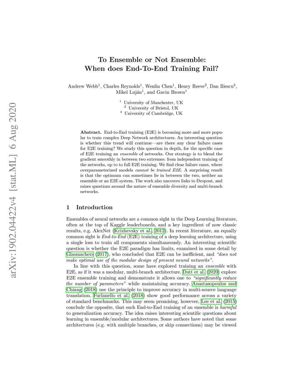End-to-End training (E2E) is becoming more and more popular to train complex Deep Network architectures. An interesting question is whether this trend will continue-are there any clear failure cases for E2E training? We study this question in depth, for the specific case of E2E training an ensemble of networks. Our strategy is to blend the gradient smoothly in between two extremes: from independent training of the networks, up to to full E2E training. We find clear failure cases, where over-parameterized models cannot be trained E2E. A surprising result is that the optimum can sometimes lie in between the two, neither an ensemble or an E2E system. The work also uncovers links to Dropout, and raises questions around the nature of ensemble diversity and multi-branch networks.
