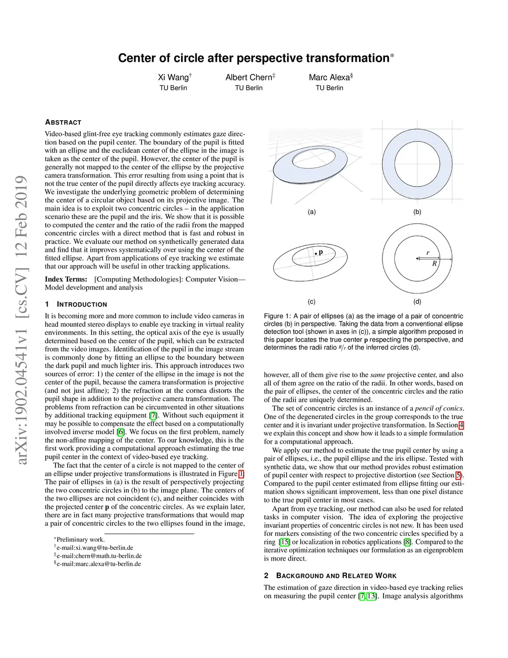 Video-based glint-free eye tracking commonly estimates gaze direction based on the pupil center. The boundary of the pupil is fitted with an ellipse and the euclidean center of the ellipse in the image is taken as the center of the pupil. However, the center of the pupil is generally not mapped to the center of the ellipse by the projective camera transformation. This error resulting from using a point that is not the true center of the pupil directly affects eye tracking accuracy. We investigate the underlying geometric problem of determining the center of a circular object based on its projective image. The main idea is to exploit two concentric circles -- in the application scenario these are the pupil and the iris. We show that it is possible to computed the center and the ratio of the radii from the mapped concentric circles with a direct method that is fast and robust in practice. We evaluate our method on synthetically generated data and find that it improves systematically over using the center of the fitted ellipse. Apart from applications of eye tracking we estimate that our approach will be useful in other tracking applications.