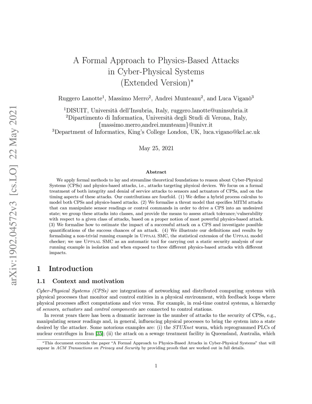 We apply formal methods to lay and streamline theoretical foundations to reason about Cyber-Physical Systems (CPSs) and physics-based attacks, i.e., attacks targeting physical devices. We focus on a formal treatment of both integrity and denial of service attacks to sensors and actuators of CPSs, and on the timing aspects of these attacks. Our contributions are fourfold. (1)~We define a hybrid process calculus to model both CPSs and physics-based attacks. (2)~We formalise a threat model that specifies MITM attacks that can manipulate sensor readings or control commands in order to drive a CPS into an undesired state, and we provide the means to assess attack tolerance/vulnerability with respect to a given attack. (3)~We formalise how to estimate the impact of a successful attack on a CPS and investigate possible quantifications of the success chances of an attack. (4)~We illustrate our definitions and results by formalising a non-trivial running example in Uppaal SMC, the statistical extension of the Uppaal model checker; we use Uppaal SMC as an automatic tool for carrying out a static security analysis of our running example in isolation and when exposed to three different physics-based attacks with different impacts.