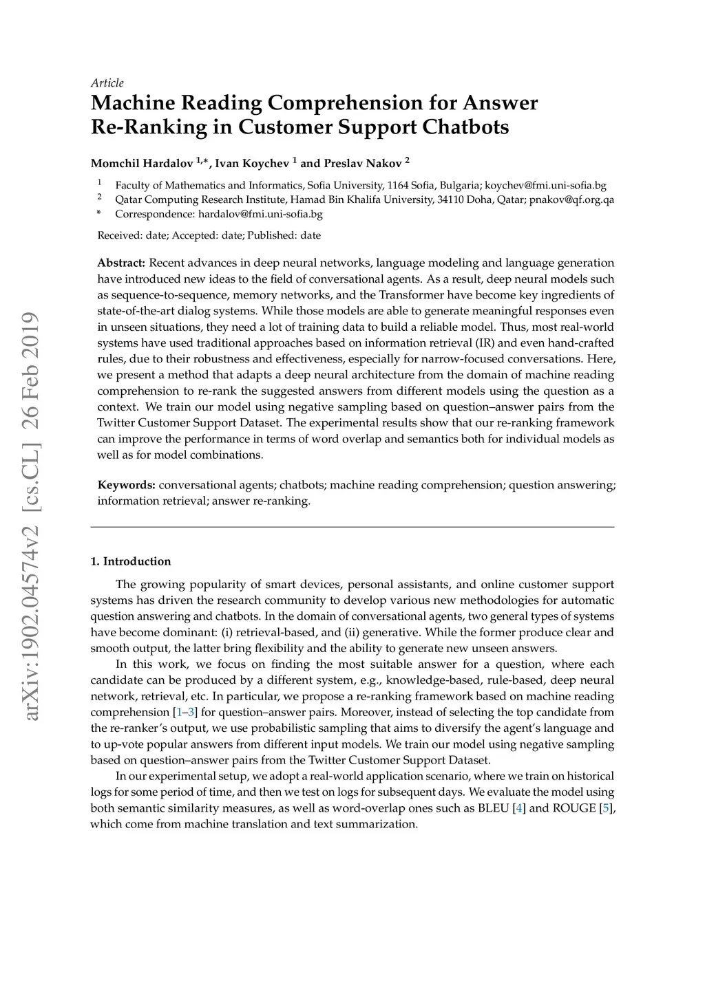 Recent advances in deep neural networks, language modeling and language generation have introduced new ideas to the field of conversational agents. As a result, deep neural models such as sequence-to-sequence, Memory Networks, and the Transformer have become key ingredients of state-of-the-art dialog systems. While those models are able to generate meaningful responses even in unseen situation, they need a lot of training data to build a reliable model. Thus, most real-world systems stuck to traditional approaches based on information retrieval and even hand-crafted rules, due to their robustness and effectiveness, especially for narrow-focused conversations. Here, we present a method that adapts a deep neural architecture from the domain of machine reading comprehension to re-rank the suggested answers from different models using the question as context. We train our model using negative sampling based on question-answer pairs from the Twitter Customer Support Dataset.The experimental results show that our re-ranking framework can improve the performance in terms of word overlap and semantics both for individual models as well as for model combinations.