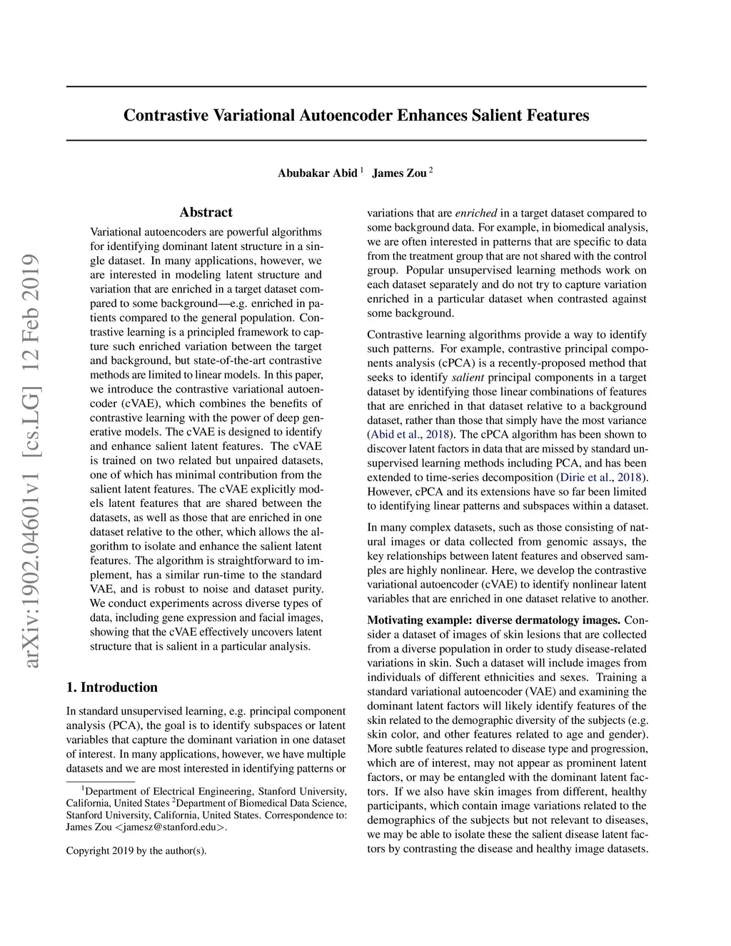 Variational autoencoders are powerful algorithms for identifying dominant latent structure in a single dataset. In many applications, however, we are interested in modeling latent structure and variation that are enriched in a target dataset compared to some background---e.g. enriched in patients compared to the general population. Contrastive learning is a principled framework to capture such enriched variation between the target and background, but state-of-the-art contrastive methods are limited to linear models. In this paper, we introduce the contrastive variational autoencoder (cVAE), which combines the benefits of contrastive learning with the power of deep generative models. The cVAE is designed to identify and enhance salient latent features. The cVAE is trained on two related but unpaired datasets, one of which has minimal contribution from the salient latent features. The cVAE explicitly models latent features that are shared between the datasets, as well as those that are enriched in one dataset relative to the other, which allows the algorithm to isolate and enhance the salient latent features. The algorithm is straightforward to implement, has a similar run-time to the standard VAE, and is robust to noise and dataset purity. We conduct experiments across diverse types of data, including gene expression and facial images, showing that the cVAE effectively uncovers latent structure that is salient in a particular analysis.