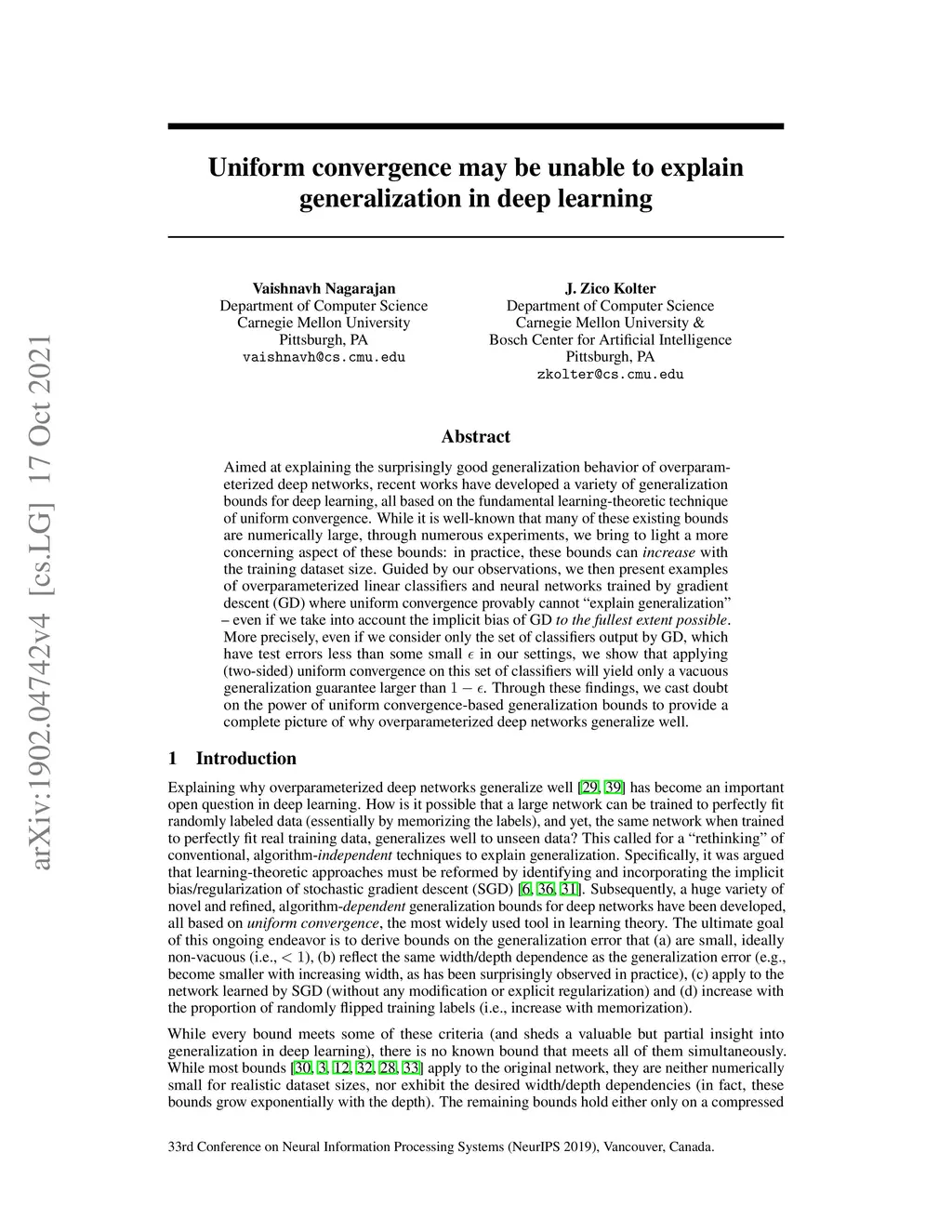 Uniform convergence may be unable to explain generalization in deep