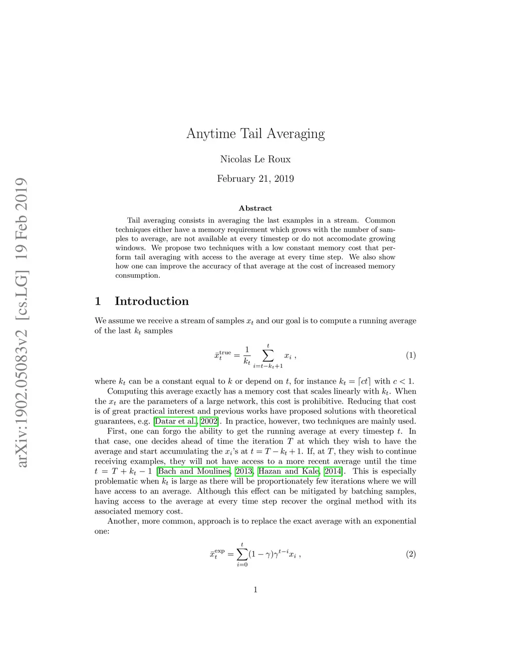 Tail averaging consists in averaging the last examples in a stream. Common techniques either have a memory requirement which grows with the number of samples to average, are not available at every timestep or do not accomodate growing windows. We propose two techniques with a low constant memory cost that perform tail averaging with access to the average at every time step. We also show how one can improve the accuracy of that average at the cost of increased memory consumption.