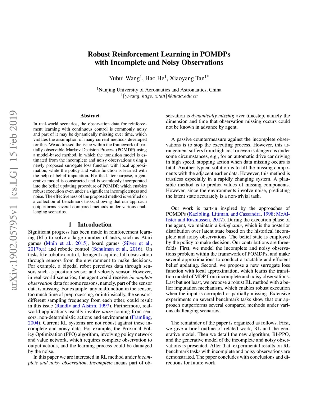 In real-world scenarios, the observation data for reinforcement learning with continuous control is commonly noisy and part of it may be dynamically missing over time, which violates the assumption of many current methods developed for this. We addressed the issue within the framework of partially observable Markov Decision Process (POMDP) using a model-based method, in which the transition model is estimated from the incomplete and noisy observations using a newly proposed surrogate loss function with local approximation, while the policy and value function is learned with the help of belief imputation. For the latter purpose, a generative model is constructed and is seamlessly incorporated into the belief updating procedure of POMDP, which enables robust execution even under a significant incompleteness and noise. The effectiveness of the proposed method is verified on a collection of benchmark tasks, showing that our approach outperforms several compared methods under various challenging scenarios.
