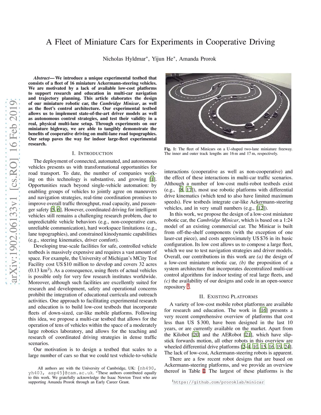 We introduce a unique experimental testbed that consists of a fleet of 16 miniature Ackermann-steering vehicles. We are motivated by a lack of available low-cost platforms to support research and education in multi-car navigation and trajectory planning. This article elaborates the design of our miniature robotic car, the Cambridge Minicar, as well as the fleet's control architecture. Our experimental testbed allows us to implement state-of-the-art driver models as well as autonomous control strategies, and test their validity in a real, physical multi-lane setup. Through experiments on our miniature highway, we are able to tangibly demonstrate the benefits of cooperative driving on multi-lane road topographies. Our setup paves the way for indoor large-fleet experimental research.
