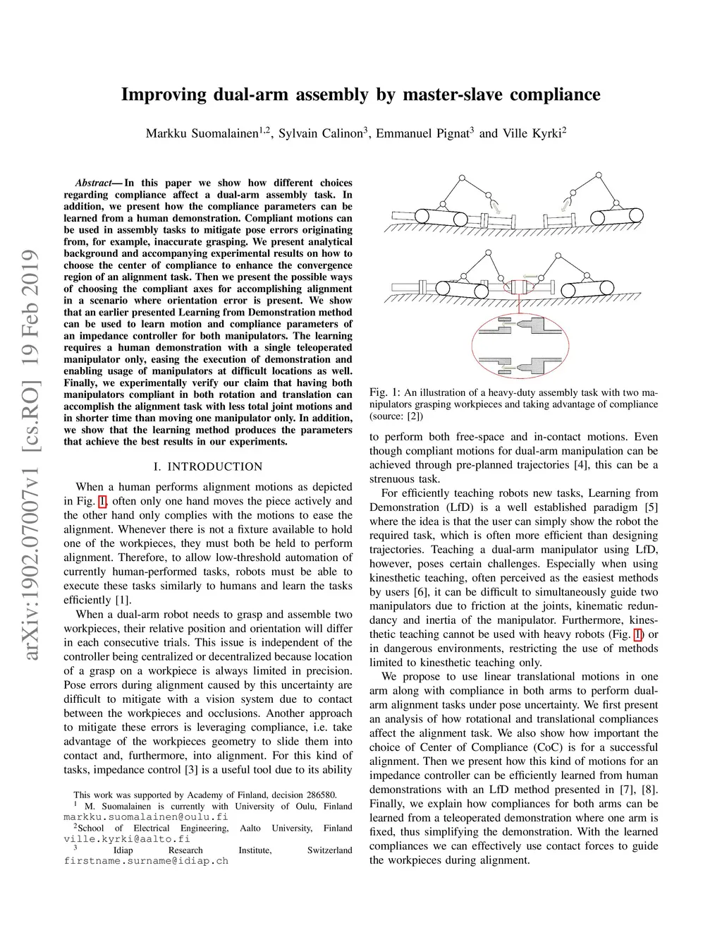 In this paper we show how different choices regarding compliance affect a dual-arm assembly task. In addition, we present how the compliance parameters can be learned from a human demonstration. Compliant motions can be used in assembly tasks to mitigate pose errors originating from, for example, inaccurate grasping. We present analytical background and accompanying experimental results on how to choose the center of compliance to enhance the convergence region of an alignment task. Then we present the possible ways of choosing the compliant axes for accomplishing alignment in a scenario where orientation error is present. We show that an earlier presented Learning from Demonstration method can be used to learn motion and compliance parameters of an impedance controller for both manipulators. The learning requires a human demonstration with a single teleoperated manipulator only, easing the execution of demonstration and enabling usage of manipulators at difficult locations as well. Finally, we experimentally verify our claim that having both manipulators compliant in both rotation and translation can accomplish the alignment task with less total joint motions and in shorter time than moving one manipulator only. In addition, we show that the learning method produces the parameters that achieve the best results in our experiments.