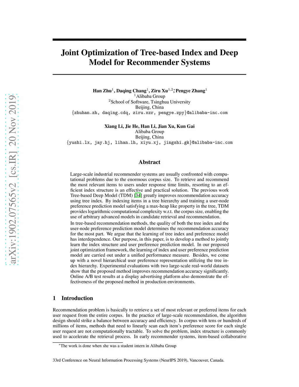 Large-scale industrial recommender systems are usually confronted with computational problems due to the enormous corpus size. To retrieve and recommend the most relevant items to users under response time limits, resorting to an efficient index structure is an effective and practical solution. The previous work Tree-based Deep Model (TDM) \cite{zhu2018learning} greatly improves recommendation accuracy using tree index. By indexing items in a tree hierarchy and training a user-node preference prediction model satisfying a max-heap like property in the tree, TDM provides logarithmic computational complexity w.r.t. the corpus size, enabling the use of arbitrary advanced models in candidate retrieval and recommendation. In tree-based recommendation methods, the quality of both the tree index and the user-node preference prediction model determines the recommendation accuracy for the most part. We argue that the learning of tree index and preference model has interdependence. Our purpose, in this paper, is to develop a method to jointly learn the index structure and user preference prediction model. In our proposed joint optimization framework, the learning of index and user preference prediction model are carried out under a unified performance measure. Besides, we come up with a novel hierarchical user preference representation utilizing the tree index hierarchy. Experimental evaluations with two large-scale real-world datasets show that the proposed method improves recommendation accuracy significantly. Online A/B test results at a display advertising platform also demonstrate the effectiveness of the proposed method in production environments.
