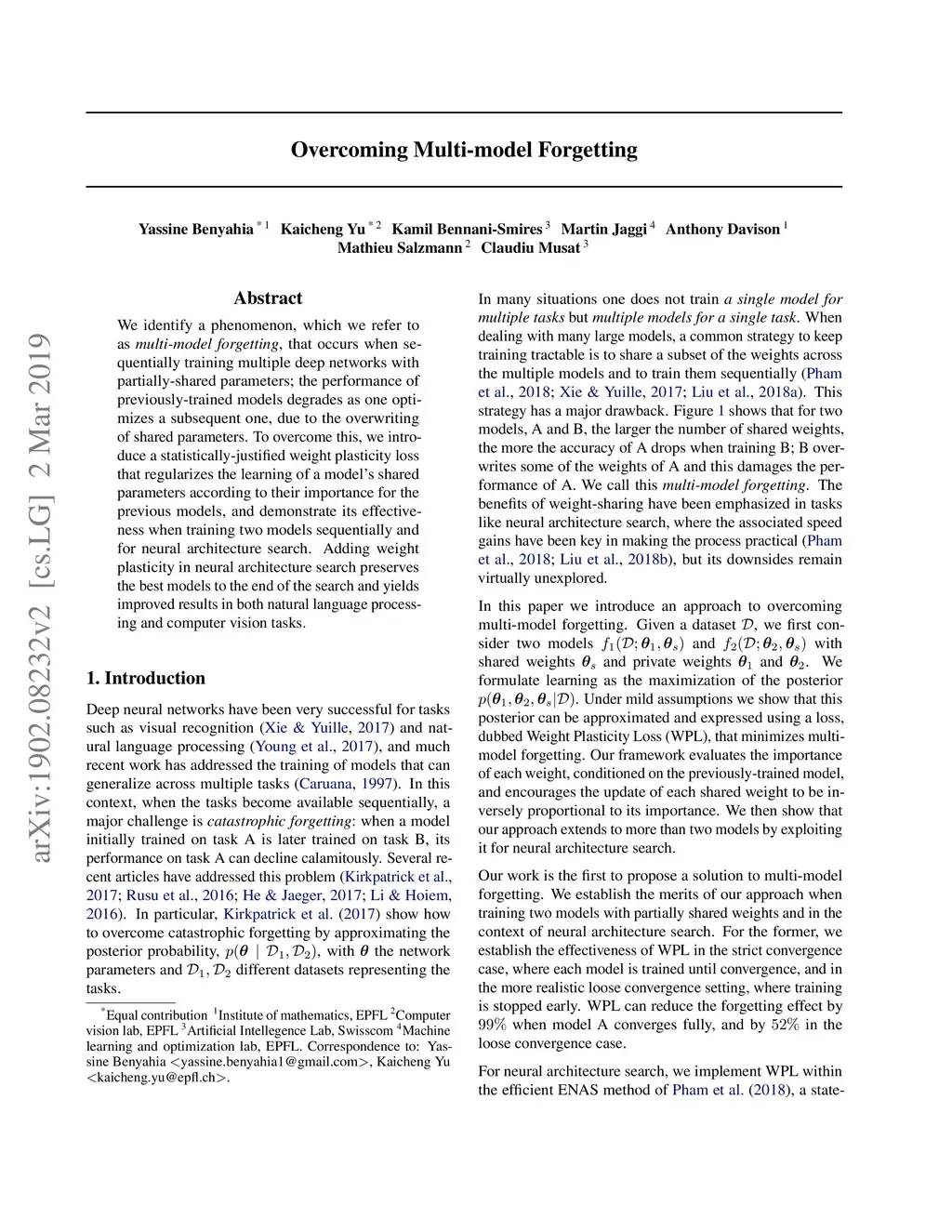 We identify a phenomenon, which we refer to as multi-model forgetting, that occurs when sequentially training multiple deep networks with partially-shared parameters; the performance of previously-trained models degrades as one optimizes a subsequent one, due to the overwriting of shared parameters. To overcome this, we introduce a statistically-justified weight plasticity loss that regularizes the learning of a model's shared parameters according to their importance for the previous models, and demonstrate its effectiveness when training two models sequentially and for neural architecture search. Adding weight plasticity in neural architecture search preserves the best models to the end of the search and yields improved results in both natural language processing and computer vision tasks.