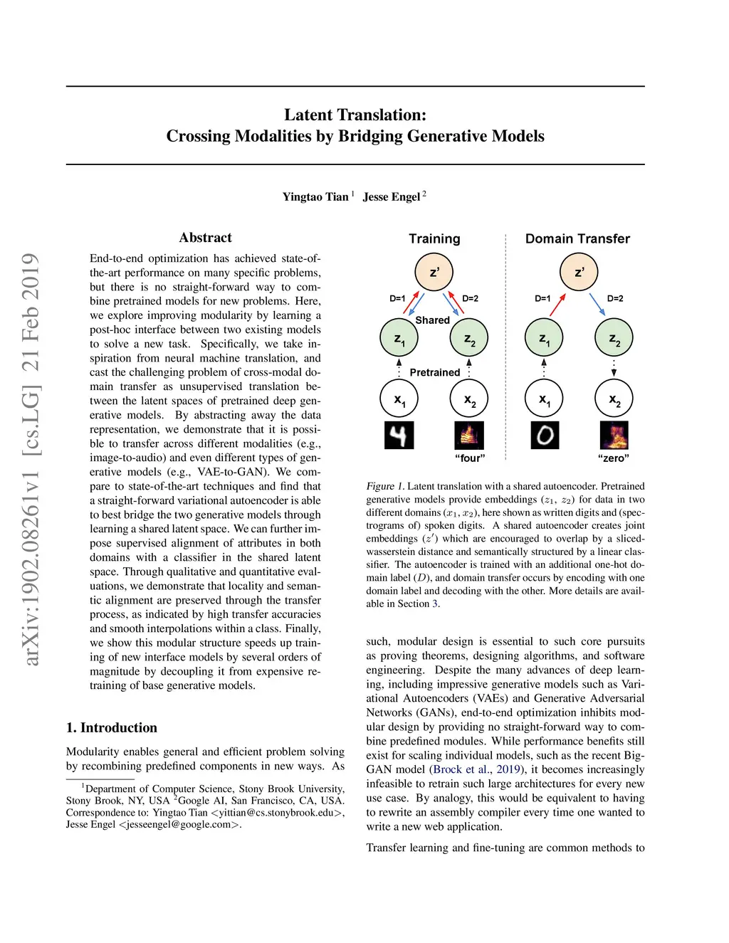 End-to-end optimization has achieved state-of-the-art performance on many specific problems, but there is no straight-forward way to combine pretrained models for new problems. Here, we explore improving modularity by learning a post-hoc interface between two existing models to solve a new task. Specifically, we take inspiration from neural machine translation, and cast the challenging problem of cross-modal domain transfer as unsupervised translation between the latent spaces of pretrained deep generative models. By abstracting away the data representation, we demonstrate that it is possible to transfer across different modalities (e.g., image-to-audio) and even different types of generative models (e.g., VAE-to-GAN). We compare to state-of-the-art techniques and find that a straight-forward variational autoencoder is able to best bridge the two generative models through learning a shared latent space. We can further impose supervised alignment of attributes in both domains with a classifier in the shared latent space. Through qualitative and quantitative evaluations, we demonstrate that locality and semantic alignment are preserved through the transfer process, as indicated by high transfer accuracies and smooth interpolations within a class. Finally, we show this modular structure speeds up training of new interface models by several orders of magnitude by decoupling it from expensive retraining of base generative models.