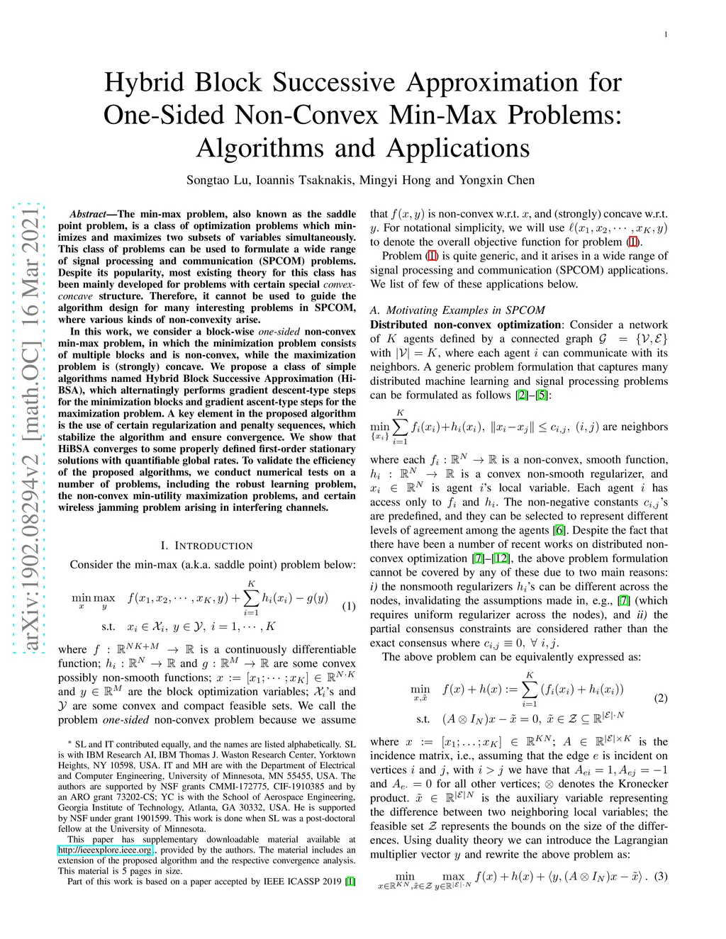 The min-max problem, also known as the saddle point problem, is a class of optimization problems which minimizes and maximizes two subsets of variables simultaneously. This class of problems can be used to formulate a wide range of signal processing and communication (SPCOM) problems. Despite its popularity, most existing theory for this class has been mainly developed for problems with certain special convex-concave structure. Therefore, it cannot be used to guide the algorithm design for many interesting problems in SPCOM, where various kinds of non-convexity arise. In this work, we consider a block-wise one-sided non-convex min-max problem, in which the minimization problem consists of multiple blocks and is non-convex, while the maximization problem is (strongly) concave. We propose a class of simple algorithms named Hybrid Block Successive Approximation (HiBSA), which alternatingly perform gradient descent-type steps for the minimization blocks and gradient ascent-type steps for the maximization problem. A key element in the proposed algorithm is the use of certain regularization and penalty sequences, which stabilize the algorithm and ensure convergence. We show that HiBSA converges to some properly defined first-order stationary solutions with quantifiable global rates. To validate the efficiency of the proposed algorithms, we conduct numerical tests on a number of problems, including the robust learning problem, the non-convex min-utility maximization problems, and certain wireless jamming problem arising in interfering channels.
