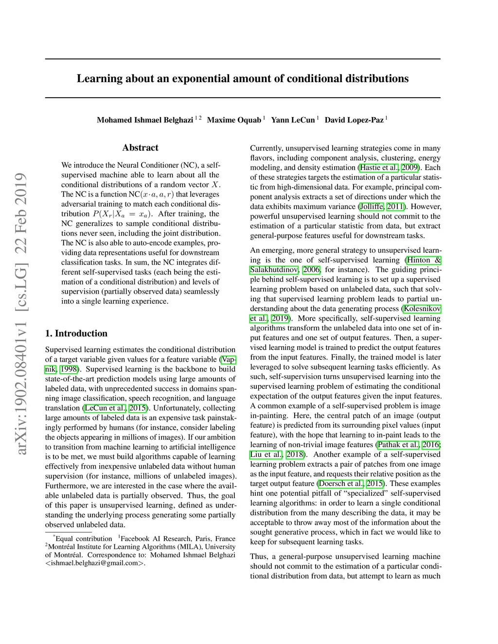 We introduce the Neural Conditioner (NC), a self-supervised machine able to learn about all the conditional distributions of a random vector . The NC is a function that leverages adversarial training to match each conditional distribution . After training, the NC generalizes to sample from conditional distributions never seen, including the joint distribution. The NC is also able to auto-encode examples, providing data representations useful for downstream classification tasks. In sum, the NC integrates different self-supervised tasks (each being the estimation of a conditional distribution) and levels of supervision (partially observed data) seamlessly into a single learning experience.