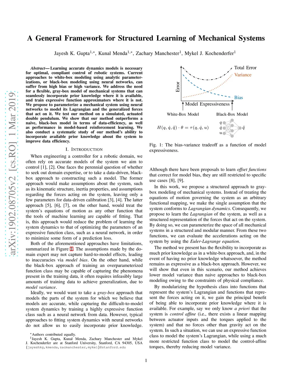 Learning accurate dynamics models is necessary for optimal, compliant control of robotic systems. Current approaches to white-box modeling using analytic parameterizations, or black-box modeling using neural networks, can suffer from high bias or high variance. We address the need for a flexible, gray-box model of mechanical systems that can seamlessly incorporate prior knowledge where it is available, and train expressive function approximators where it is not. We propose to parameterize a mechanical system using neural networks to model its Lagrangian and the generalized forces that act on it. We test our method on a simulated, actuated double pendulum. We show that our method outperforms a naive, black-box model in terms of data-efficiency, as well as performance in model-based reinforcement learning. We also conduct a systematic study of our method's ability to incorporate available prior knowledge about the system to improve data efficiency.